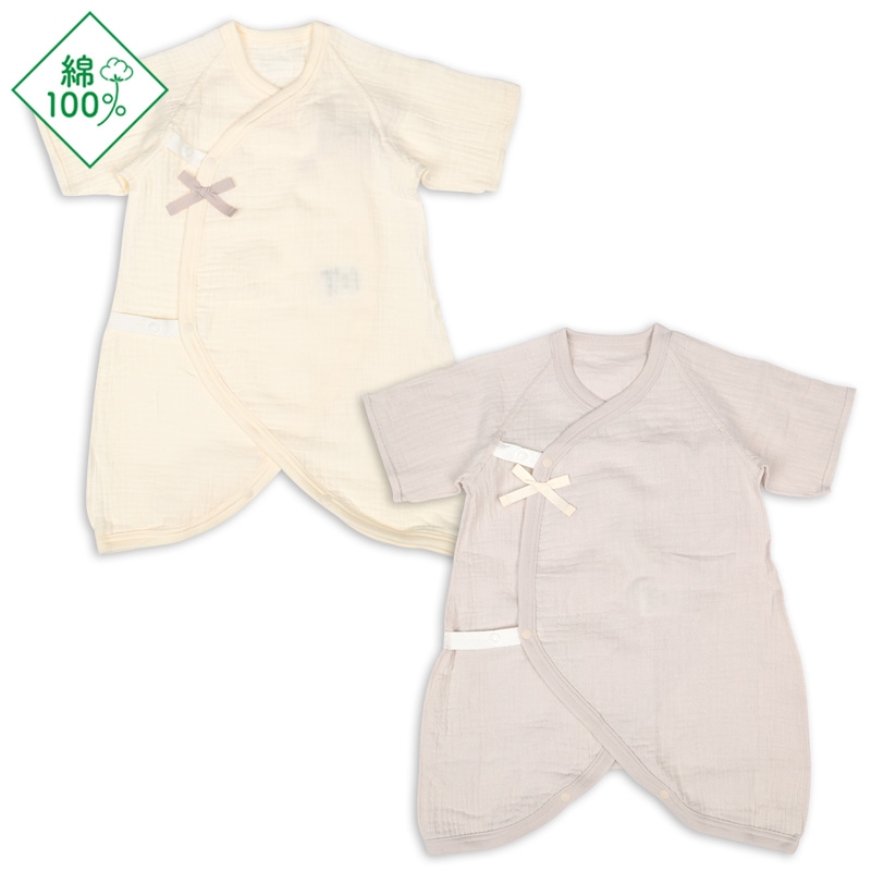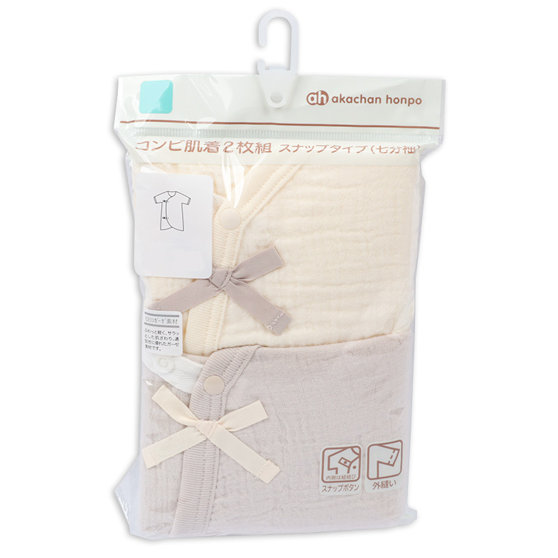コンビ肌着 七分袖 ・対象サイズ=50-60 ・身巾25.0cm、身丈46.5cm、裾巾34.0cm、袖口巾9.5cm、上腕11.5cm、裄丈23.0cm、天巾7.5cm、前下り6.0cm、後下り1.2cm パッケージサイズ=H212 W145 ・素材=綿100% ・洗濯表示=洗濯可 ・原産国=中国