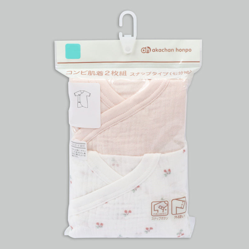 コンビ肌着 七分袖 ・対象サイズ=50-60 ・身巾25.0cm、身丈46.5cm、裾巾34.0cm、袖口巾9.5cm、上腕11.5cm、裄丈23.0cm、天巾7.5cm、前下り6.0cm、後下り1.2cm パッケージサイズ=H212 W145 ・素材=綿100% ・洗濯表示=洗濯可 ・原産国=中国
