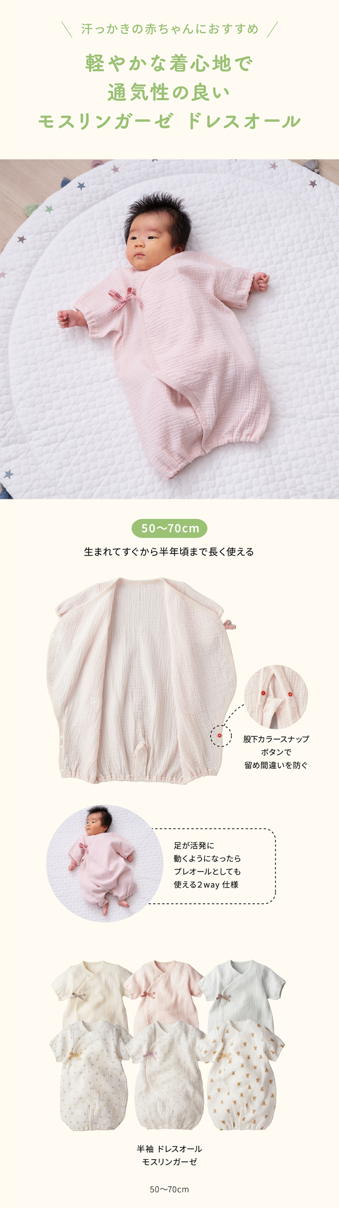 新生児夏向け、モスリンガーゼ素材のドレスオールです。 素材は、通気性と肌ざわりにとても優れた綿100%のWガーゼを使用しています。包み込むような風合いで優しい温かみもあるドレスオールを追求しました。 無地3色・総柄プリント3色 計6色展開になります。