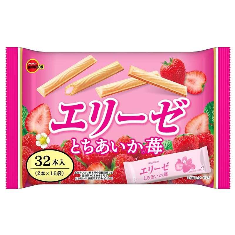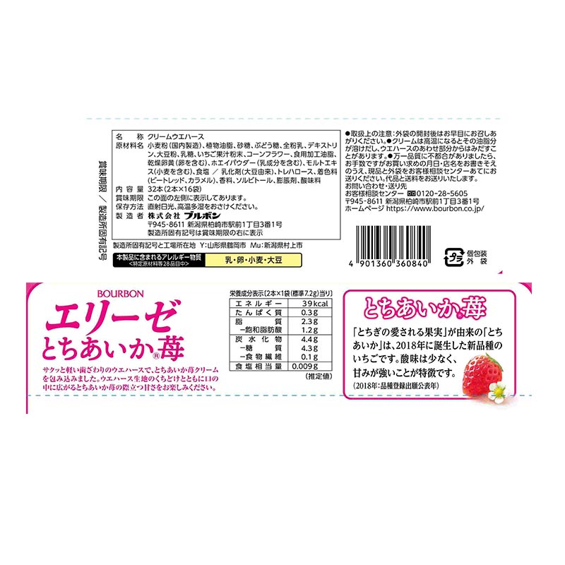 ●クリームウエハース ●原材料名:小麦粉(国内製造)、植物油脂、砂糖、ぶどう糖、全粉乳、デキストリン、大豆粉、乳糖、いちご果汁粉末、コーンフラワー、食用加工油脂、乾燥卵黄(卵を含む)、ホエイパウダー(乳成分を含む)、モルトエキス(小麦を含む)、食塩/乳化剤(大豆由来)、トレハロース、着色料(ビートレッド、カラメル)、香料、ソルビトール、膨脹剤、酸味料 ●内容量:32本(2本×16袋) ●栄養成分:2本×1袋(標準7.2g)当り 熱量 39kcal たんぱく質 0.3g 脂質 2.3g 炭水化物 4.4g 食塩相当量 0.009g 飽和脂肪酸 1.2g 糖質 4.3g 食物繊維 0.1g