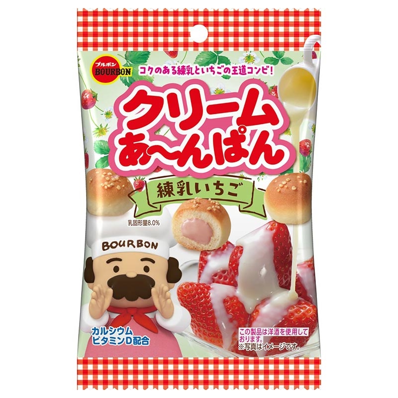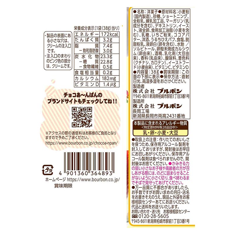 ●洋菓子 ●原材料名:小麦粉(国内製造)、砂糖、ショートニング、全粉乳、練乳加工品、マーガリン(乳成分を含む)、デキストリン、イースト、液全卵、食用加工油脂(小麦を含む)、乳糖、いちご粉末、ココアバター、洋酒、うるちひえパフ、食塩、脱脂粉乳、液卵白(卵を含む)、水飴/ソルビトール、卵殻未焼成カルシウム(卵由来)、酒精、乳化剤(大豆由来)、香料(乳由来)、酸味料、着色料(クチナシ、カロテン)、イーストフード(小麦由来)、ビタミンC、ビタミンD ●内容量:38g ●栄養成分:1袋(38g)当り 熱量 172kcal たんぱく質 3.2g 脂質 7.4g 炭水化物 23.3g 食塩相当量 0.2g 飽和脂肪酸 3.0g 糖質 22.8g 食物繊維 0.5g カルシウム 182mg ビタミンD 1.4μg