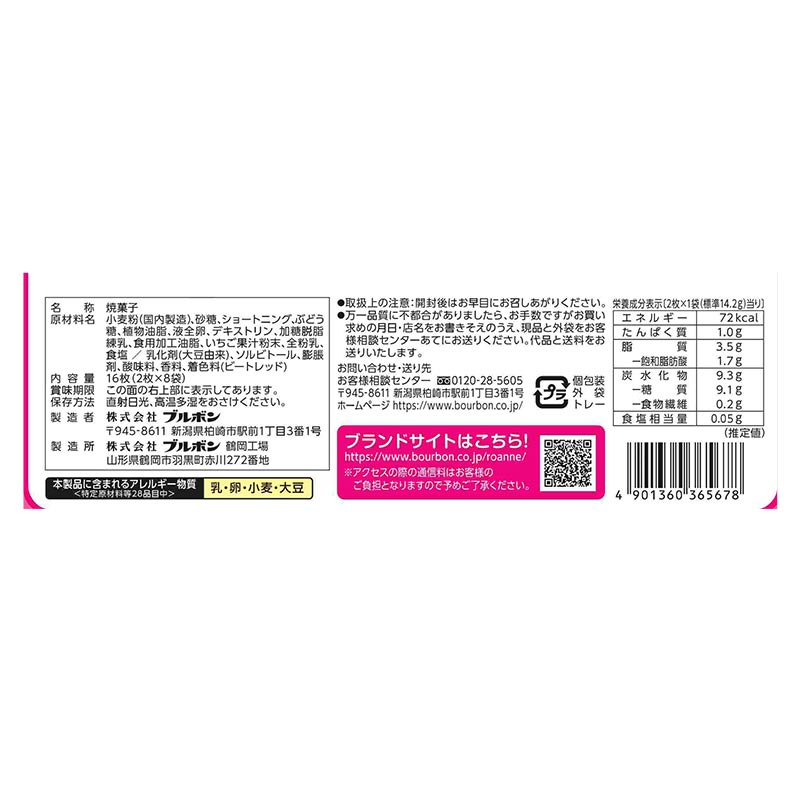 ●焼菓子 ●原材料名:小麦粉(国内製造)、砂糖、ショートニング、ぶどう糖、植物油脂、液全卵、デキストリン、加糖脱脂練乳、食用加工油脂、いちご果汁粉末、全粉乳、食塩/乳化剤(大豆由来)、ソルビトール、膨脹剤、酸味料、香料、着色料(ビートレッド) ●内容量:16枚(2枚×8袋) ●栄養成分:2枚×1袋(標準14.2g)当り 熱量 72kcal たんぱく質 1.0g 脂質 3.5g 炭水化物 9.3g 食塩相当量 0.05g 飽和脂肪酸 1.7g 糖質 9.1g 食物繊維 0.2g