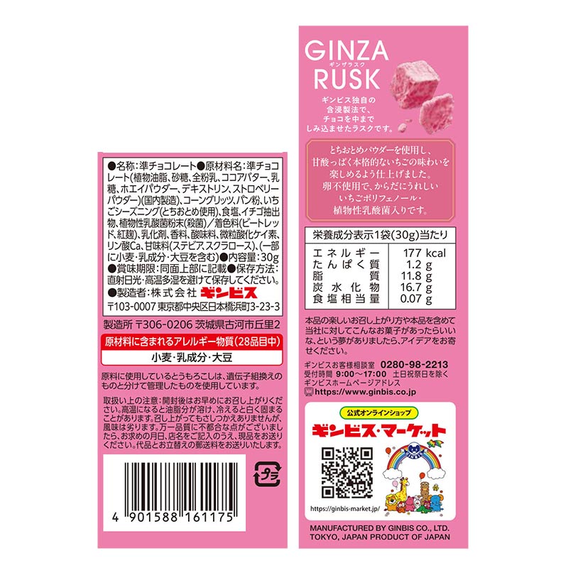 ●準チョコレート ●原材料名:準チョコレート(植物油脂、砂糖、全粉乳、ココアバター、乳糖、ホエイパウダー、デキストリン、ストロベリーパウダー)(国内製造)、コーングリッツ、パン粉、いちごシーズニング(とちおとめ使用)、食塩、イチゴ抽出物、植物性乳酸菌粉末(殺菌)/着色料(ビートレッド、紅麹)、乳化剤、香料、酸味料、微粒酸化ケイ素、リン酸Ca、甘味料(ステビア、スクラロース)、(一部に小麦・乳成分・大豆を含む) ●内容量:30g ●栄養成分:1袋(30g)当たり 熱量 177kcal たんぱく質 1.2g 脂質 11.8g 炭水化物 16.7g 食塩相当量 0.07g