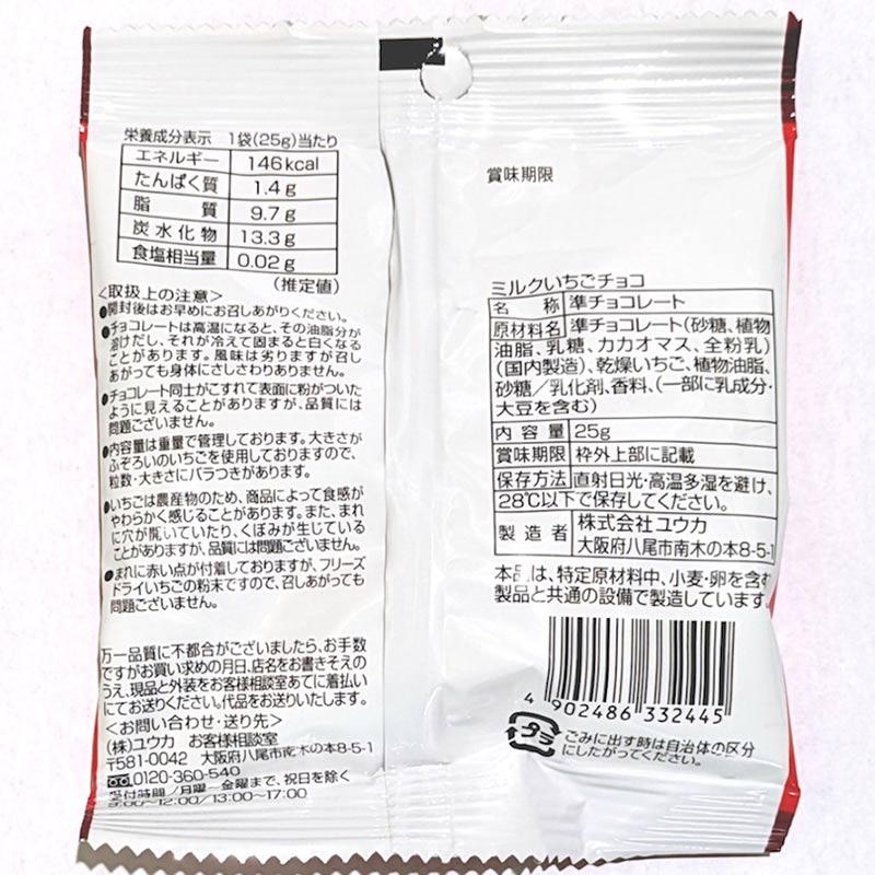 ●準チョコレート ●原材料名:準チョコレート(砂糖、植物油脂、乳糖、カカオマス、全粉乳)(国内製造)、乾燥いちご、植物油脂、砂糖/乳化剤、香料、(一部に乳成分・大豆を含む) ●内容量:25g ●栄養成分:1袋(25g)当たり 熱量 146kcal たんぱく質 1.4g 脂質 9.7g 炭水化物 13.3g 食塩相当量 0.02g