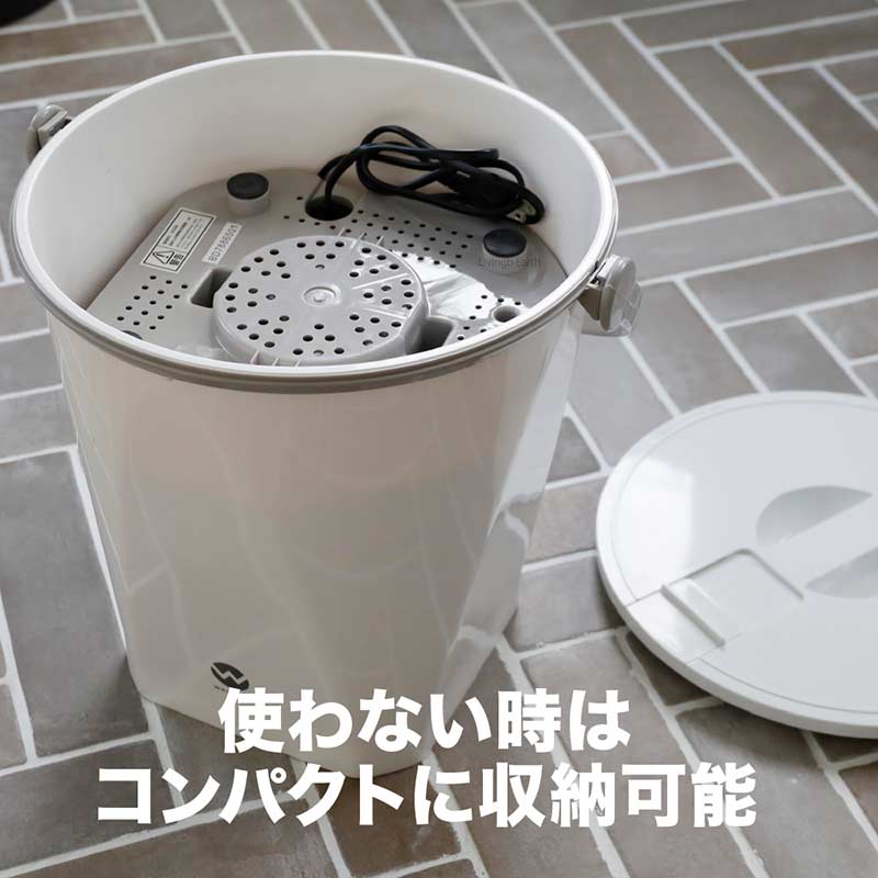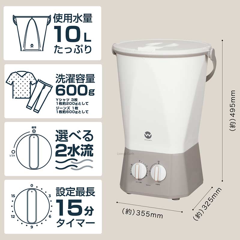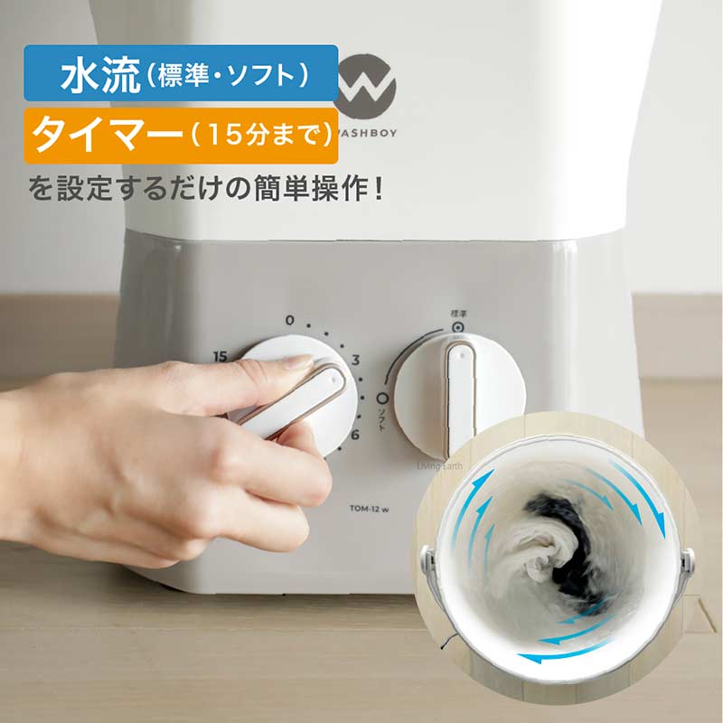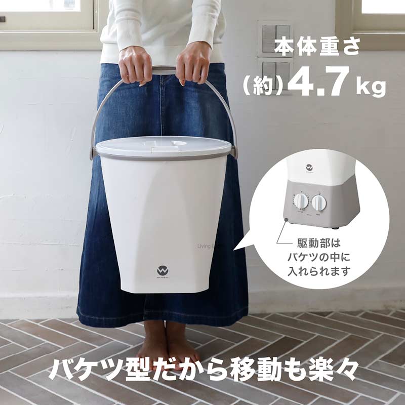●商品サイズ:幅35.5×奥行32.5×高49.5cm ※ハンドルを除く ●商品重量:4.7Kg ●電源コードの長さ:1m※延長コードのご使用はお止め下さい ●標準洗濯量:600g(乾燥時の布質量) ●標準使用水量:10L ●定格電圧:AC100V ●定格周波数:50/60Hz共用 ●定格消費電力:120W ●連続運転時間:15分 ●セット内容:バケツ部、駆動部、取扱説明書(保証書付き)※保証期間:1年間