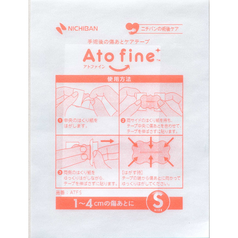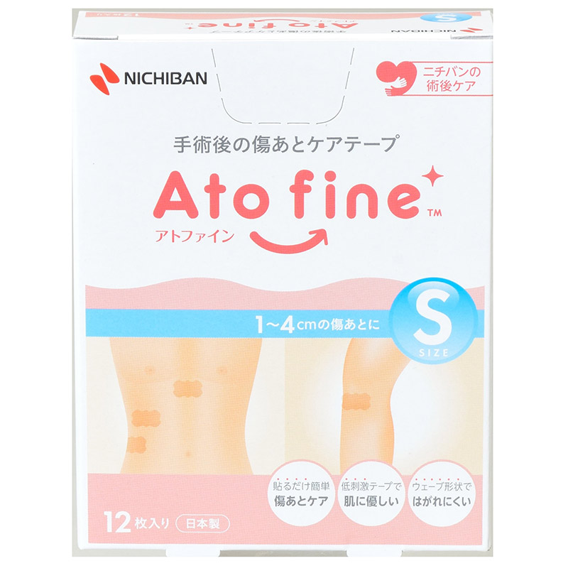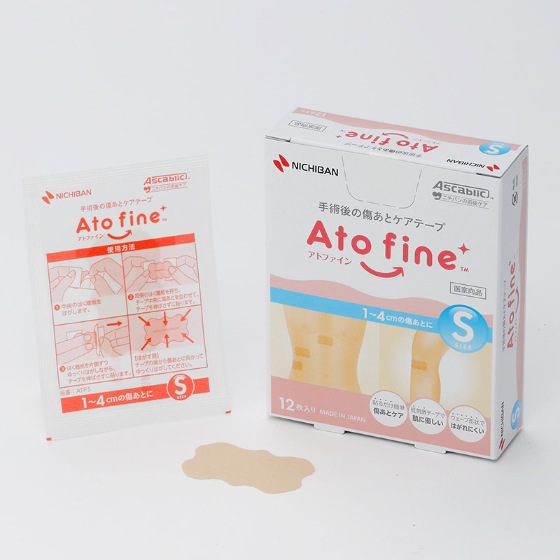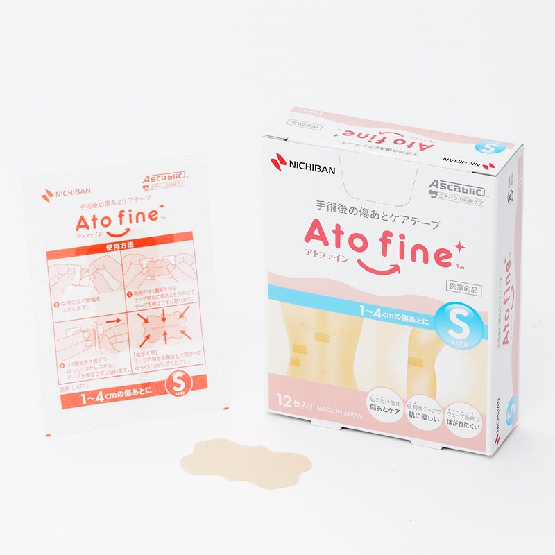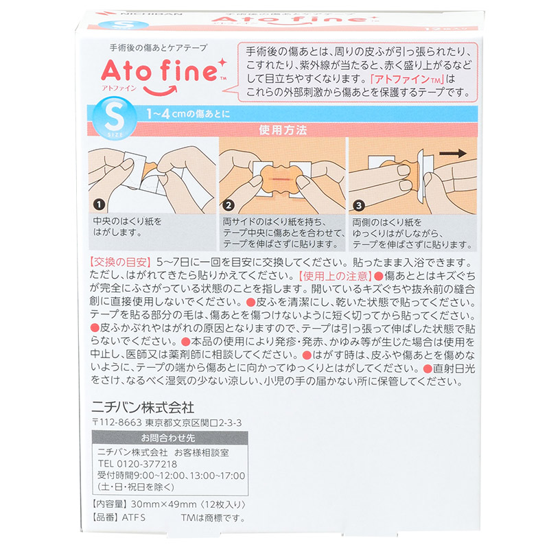 ●品番:ATFS 手術後の傷あとを、誰でも簡単にケアできるテープがアトファインです。 目立つ傷あと(肥厚性瘢痕・ケロイド)の要因となる伸展刺激・摩擦刺激・紫外線から傷あとを守ります。 ●Sサイズ:30mm×49mm(※1~4cmの「傷あと」に) ●内容量:12枚入り ●交換の目安 ・5~7日に1回を目安に交換してください。 ただし、貼付の目安に限らずテープがはがれてきたら貼り替えてください。 貼ったまま入浴できます。 使用上の注意 ・傷あととは、傷口が完全に閉じている状態のことを指します。開いている傷口や抜糸前の縫合創に直接使用しないでください。 ・皮ふを清潔にし、乾いた状態で貼ってください。テープを貼る部分の毛は、傷あとを傷つけないように注意して、短く切ってから貼ってください。 ・皮ふかぶれやはがれの原因となりますので、テープは引っ張って伸ばした状態で貼らないでください。 ・本品の使用により発疹・発赤、水疱、表皮はく離、かゆみ等が生じた場合は使用を中止し、医師又は薬剤師に相談してください。 ・はがす時は、皮ふや傷あとを傷めないように、テープの端から傷あとに向かってゆっくりとはがしてください。 ・直射日光を避け、なるべく湿気の少ない涼しい、小児の手の届かない所に保管してください。 ・再使用しないでください。