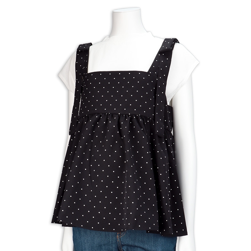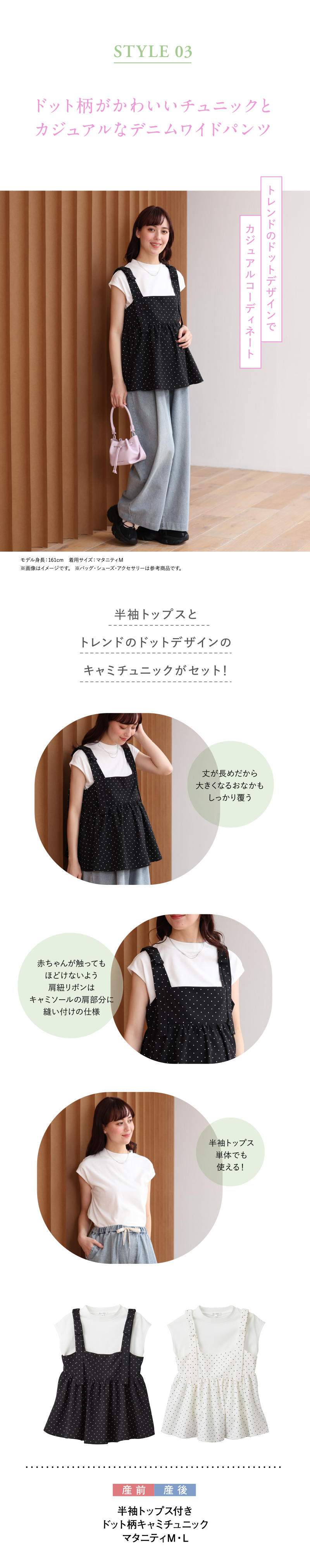 半袖無地トップスとドット柄キャミチュニックのセット商品になります。トップスは天竺素材、キャミチュニックは布帛素材となっております。授乳口は、付いておりません。キャミチュニックのスモッキング加工がおしゃれポイントです。