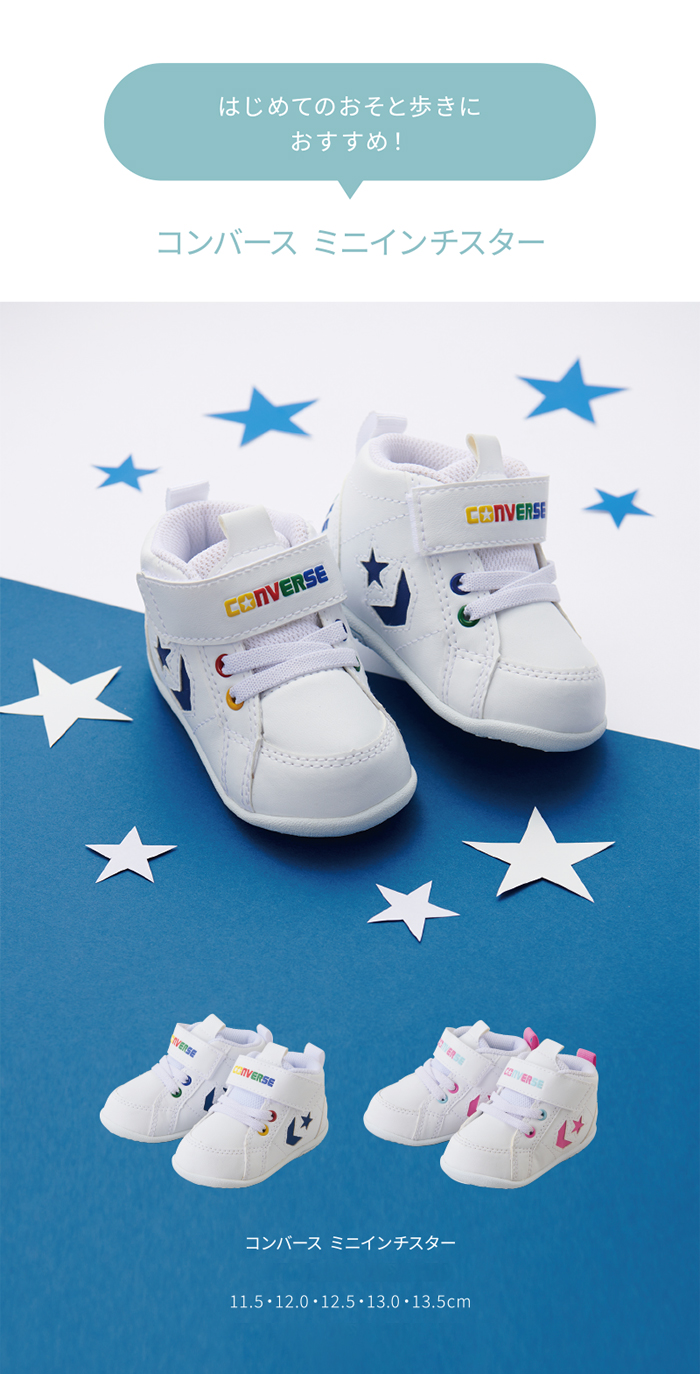 ・ベビーの足にやさしいソフトなシンセティックレザーを使用 ・歩き始めの赤ちゃんに対応した軽量で屈曲性の良いソール仕様 ・MIDカットモデルで不安定なベビーの足元をやさしくサポート ・ベルトタイプに踵ループ付きで履かせやすいデザイン