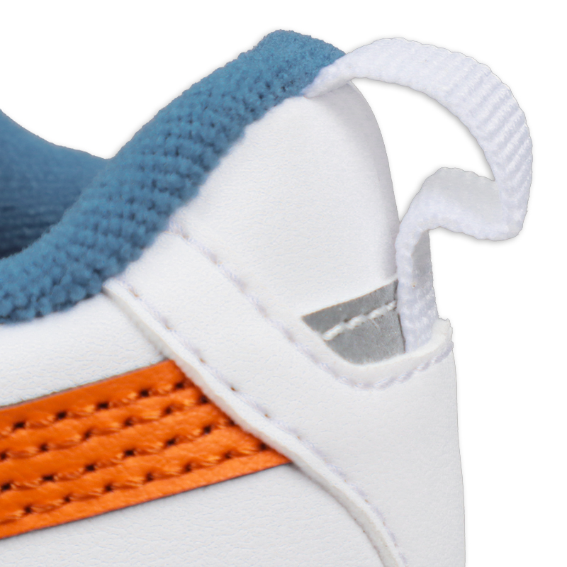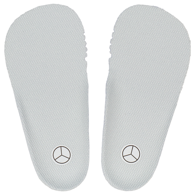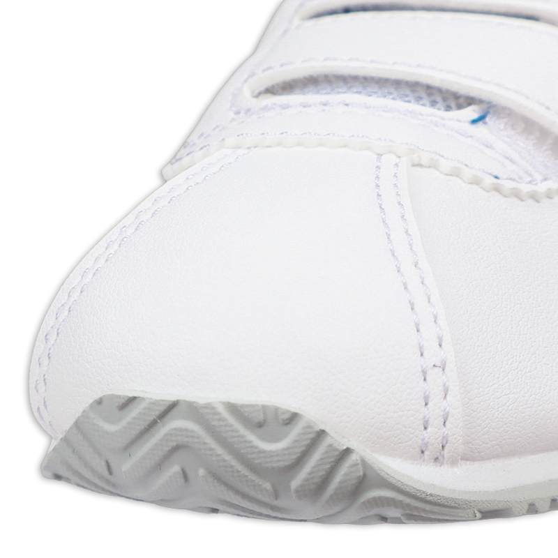 かかとの安定性を重視し、かかとを包み込む立体的な中敷を採用しています。扇形のつま先部分は足ゆびをのびのびと動かすことができ、踏ん張りやすいのが特徴。アッパーにはお手入れしやすい人工皮革を使用。