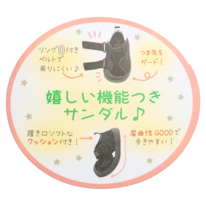 *面ファスナータイプで履かせやすい *大人でも人気なスタイル *履き口ソフトなクッション付き *アウトドアやスポーツやお出かけと汎用性が高いサンダル *つま先ガード付 *リング付きWベルトで戻りにくい *屈曲性がよく歩きやすい