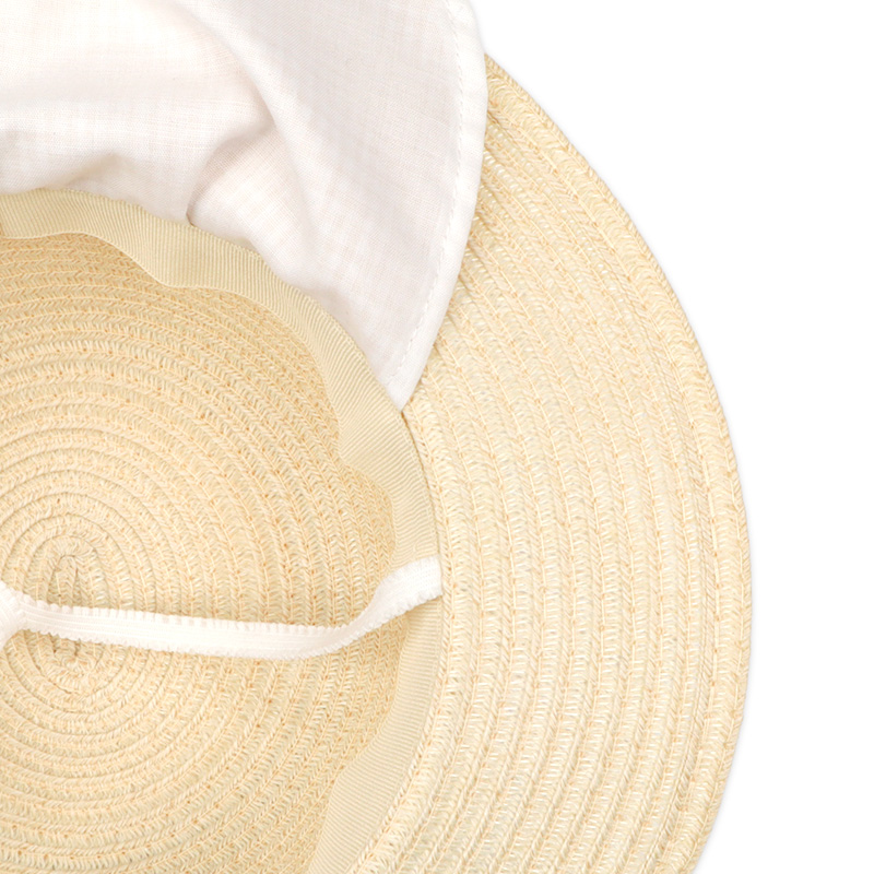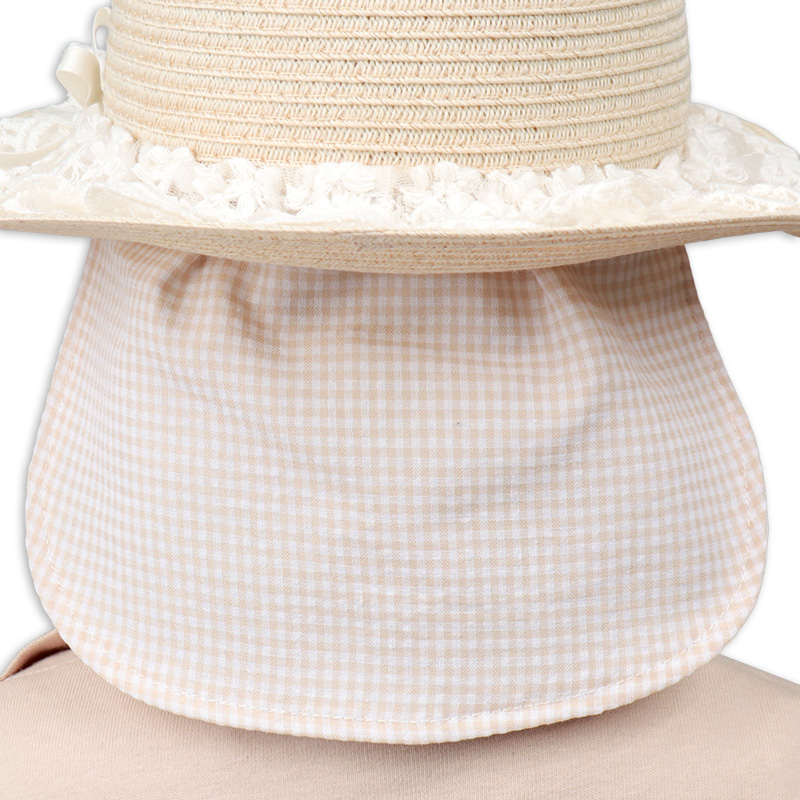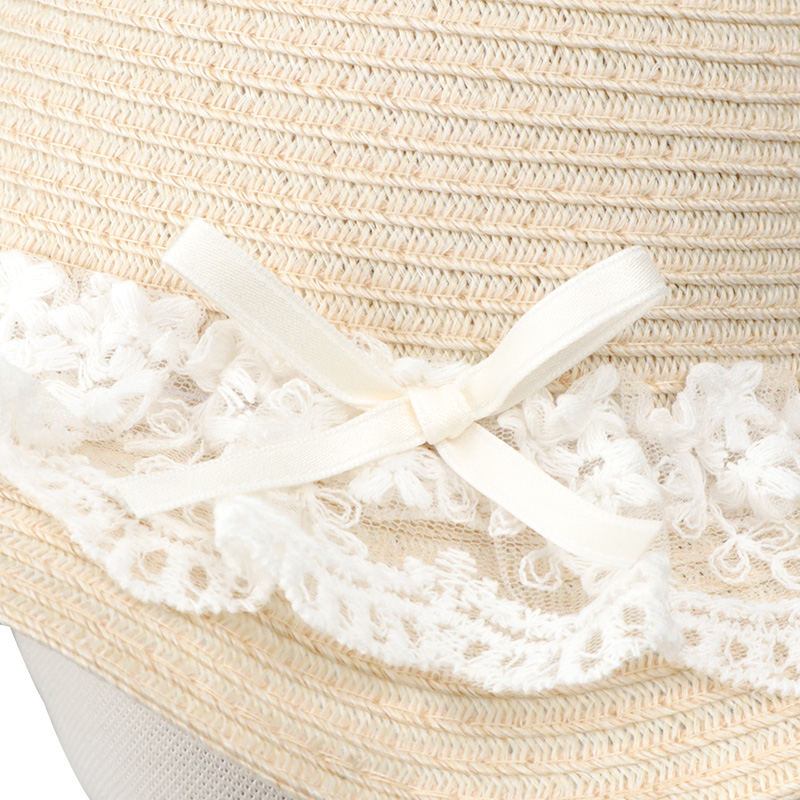 ●サイズ(約・cm)=48、50、52、54 ●素材=[本体]ポリエステル100% [レース部分](基布)ナイロン100% (刺繍糸)綿100% [日よけ表]綿52% ポリエステル48% [日よけ裏]ポリエステル97% 綿3%