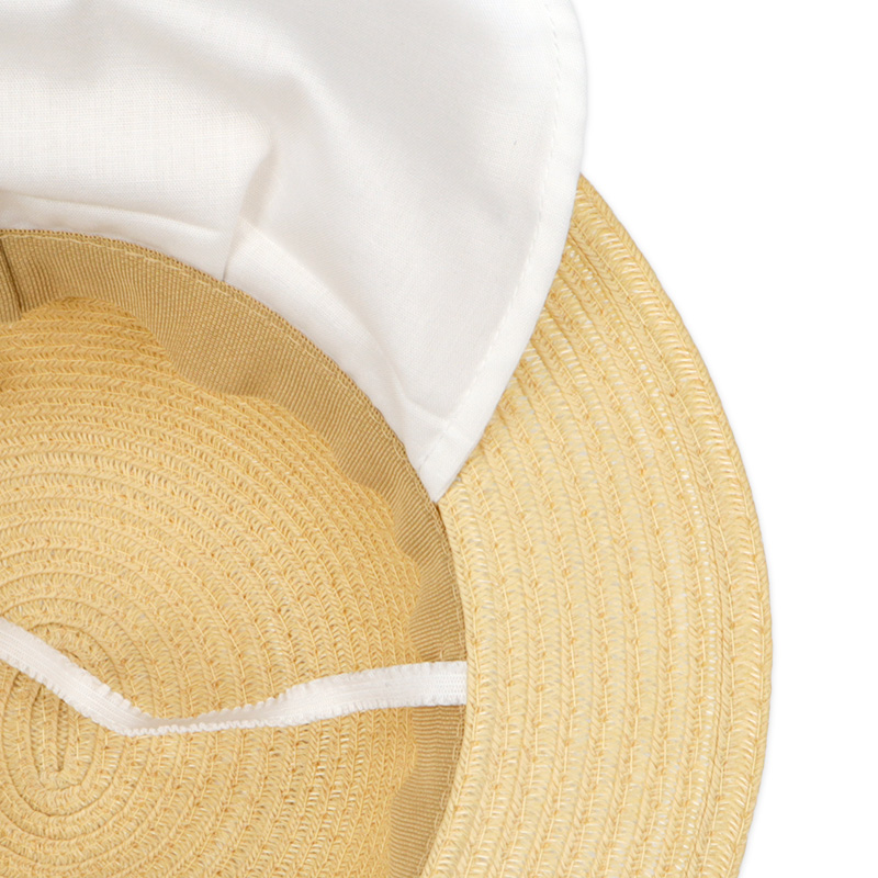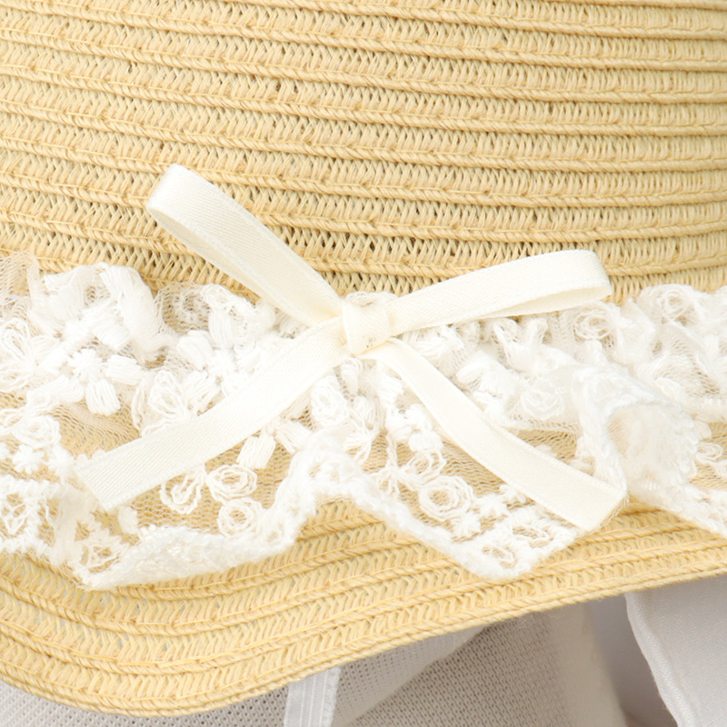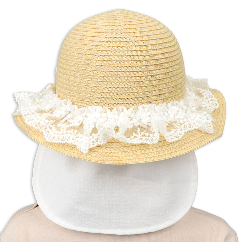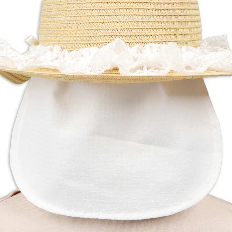 ●サイズ(約・cm)=48、50、52、54 ●素材=[本体]ポリエステル100% [レース部分](基布)ナイロン100% (刺繍糸)綿100% [日よけ表]綿52% ポリエステル48% [日よけ裏]ポリエステル97% 綿3%