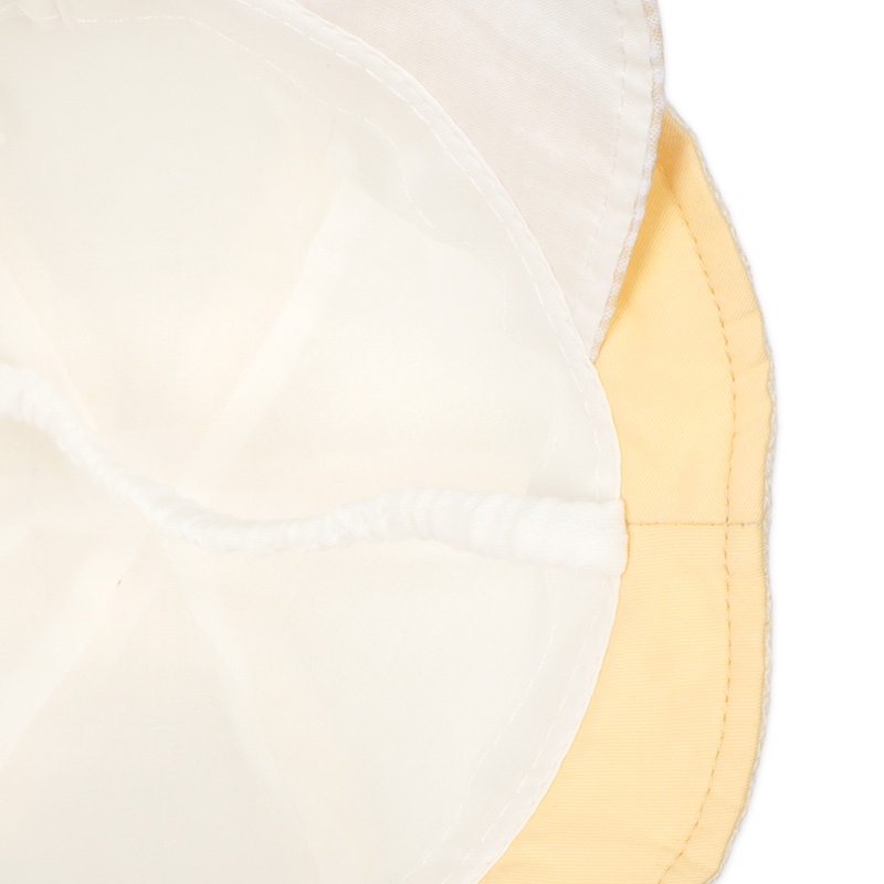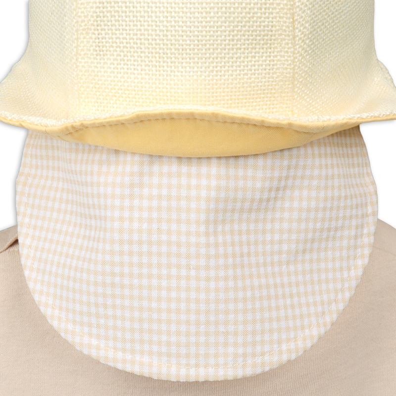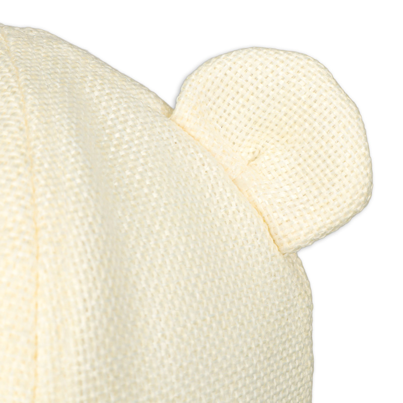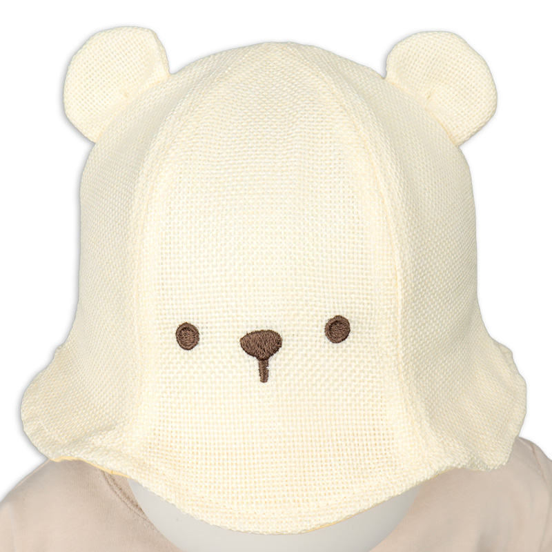 雑材の風合いがあるナチュラルな夏素材で仕上げたアイテムです。 タック入りの耳と顔刺繍が飾る、可愛らしいくまモチーフが魅力です。 洗える素材だから、外遊び後も簡単にお手入れできます。 外での活動に嬉しい日よけ付き。 風などによる帽子の落下を防ぐアゴゴム付き。 アゴゴムは生地でくるんだ仕様なので肌あたりが優しいです。