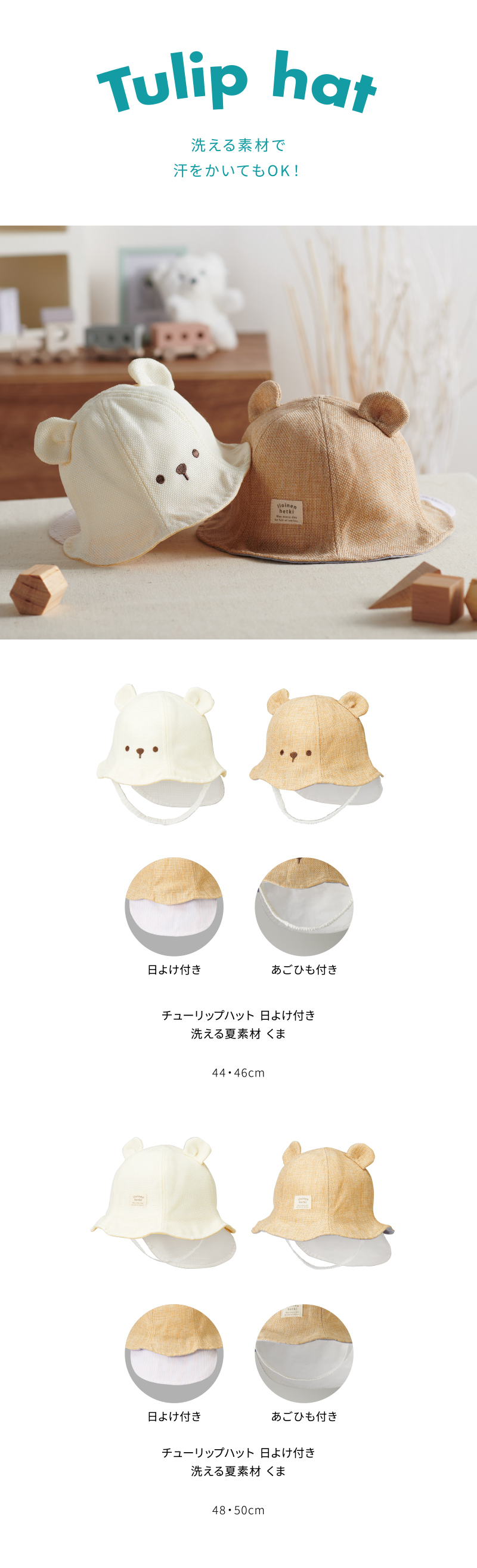 雑材の風合いがあるナチュラルな夏素材で仕上げたアイテムです。 タック入りの耳と顔刺繍が飾る、可愛らしいくまモチーフが魅力です。 洗える素材だから、外遊び後も簡単にお手入れできます。 外での活動に嬉しい日よけ付き。 風などによる帽子の落下を防ぐアゴゴム付き。 アゴゴムは生地でくるんだ仕様なので肌あたりが優しいです。
