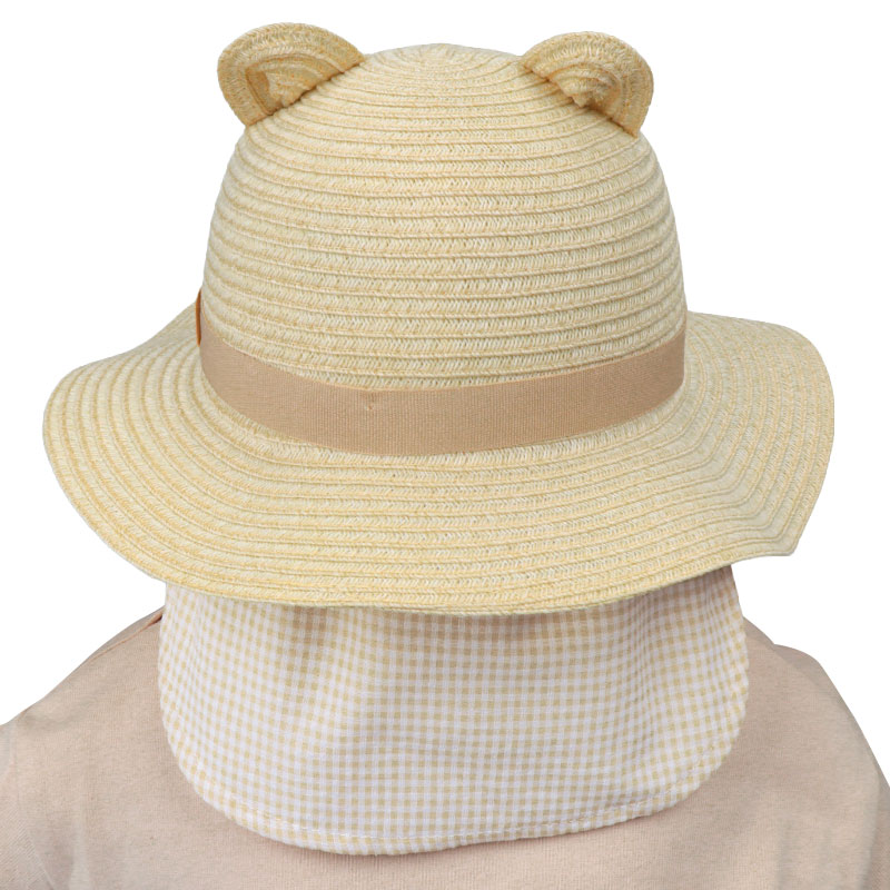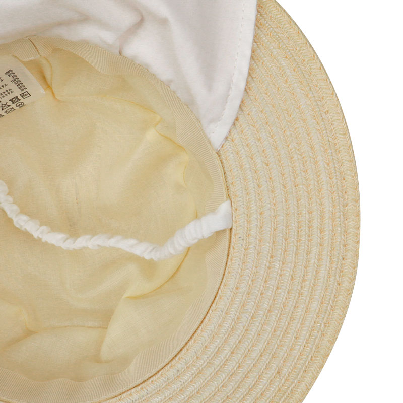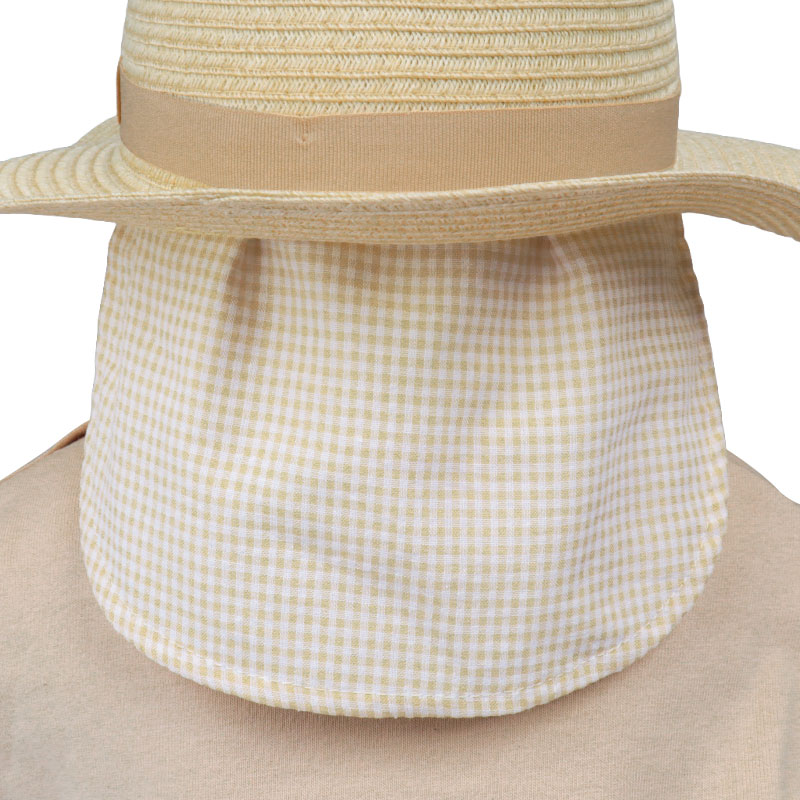 ●サイズ(約・cm)=44、46、48 ●素材=[本体]ポリエステル100% [裏地]ポリエステル97% 綿3% [リボン部分]ポリエステル100% [日よけ表]綿52% ポリエステル48% [日よけ裏]ポリエステル65% 綿35%