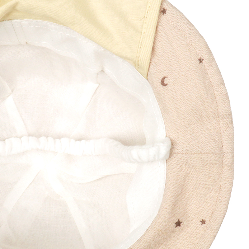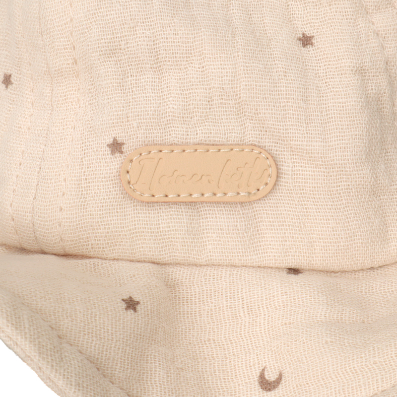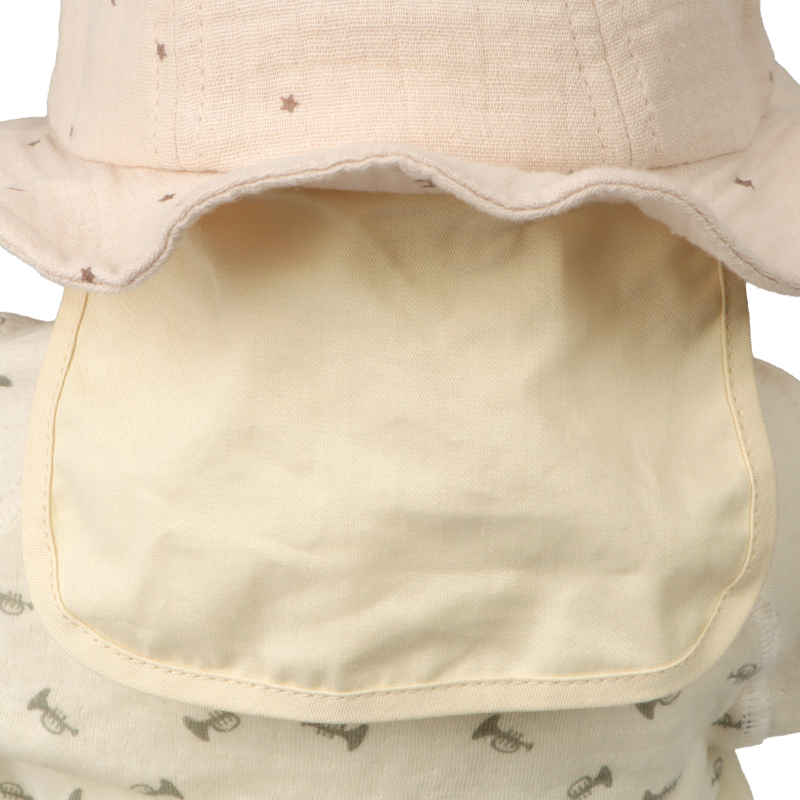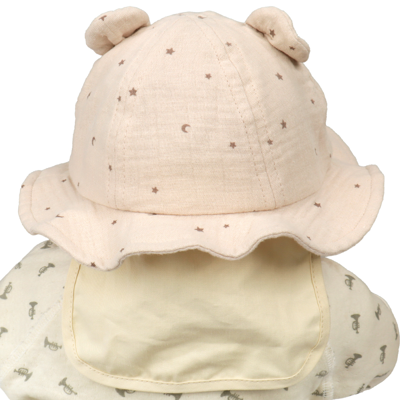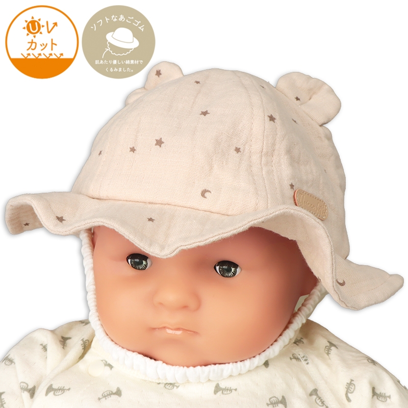 タック入りの耳が付いた、アニマルモチーフのアイテムです。 さりげない月星シルエット柄がチャームポイント。 本体にはガーゼ生地を使用しているため、軽く柔らかな仕上がりです。 外での活動に嬉しい日よけ付き。 風などによる帽子の落下を防ぐアゴゴム付き。 アゴゴムは生地でくるんだ仕様なので肌あたりが優しいです。