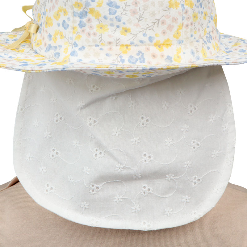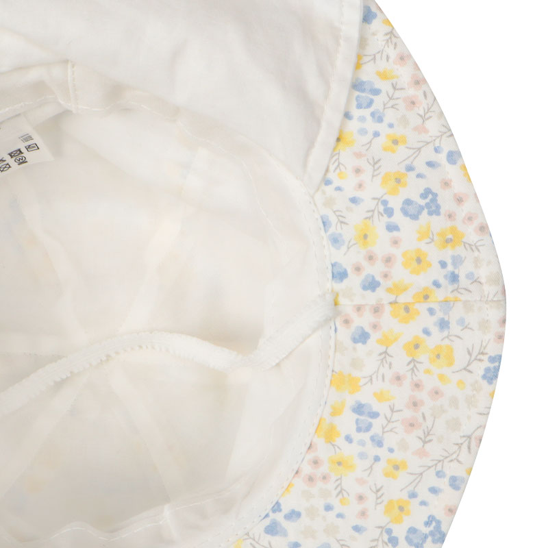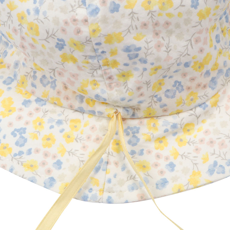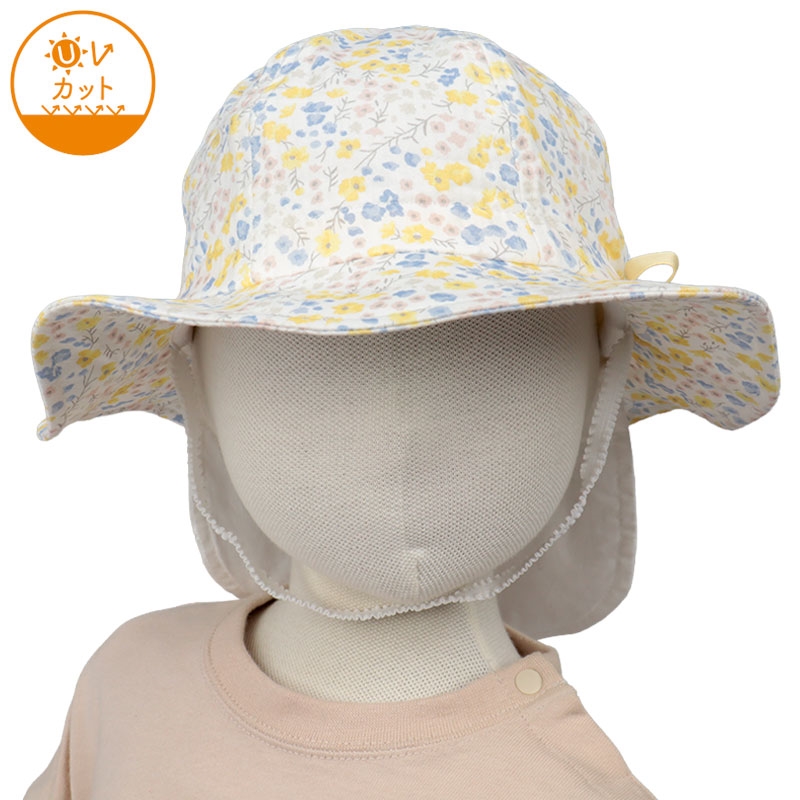 やわらかな色合いの花柄アイテムです。 ナチュラルな本体の綿素材に小花のプリントが映え、穏やかな可愛らしさを引き立てます。 サイドを飾るリボンは、ほどいて、サイズを調節して結べます。 外での活動に嬉しい日よけ付き。 風などによる帽子の落下を防ぐアゴゴム付き。