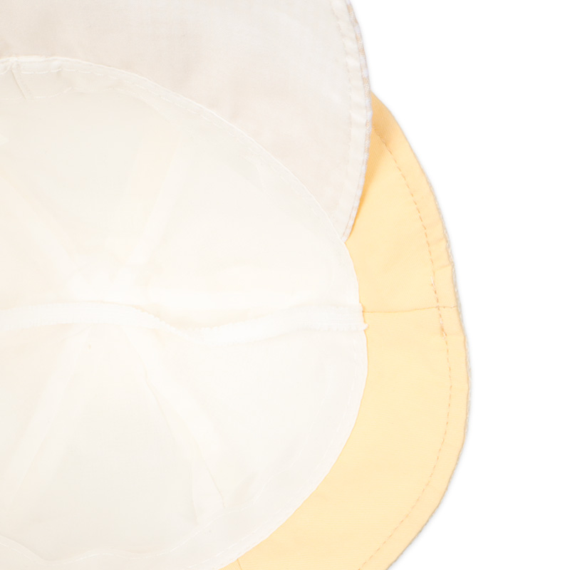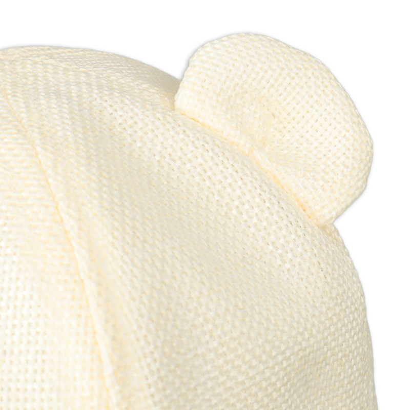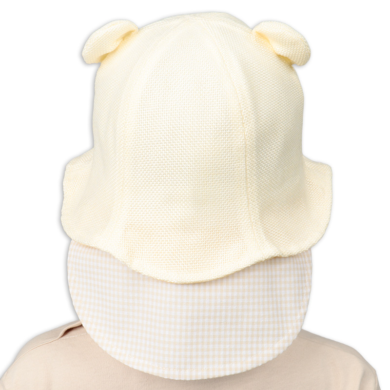 雑材の風合いがあるナチュラルな夏素材で仕上げたアイテムです。 タック入りの耳とフロント織ネームが飾る、可愛らしいくまモチーフが魅力です。 洗える素材だから、外遊び後も簡単にお手入れできます。 外での活動に嬉しい日よけ付き。 風などによる帽子の落下を防ぐアゴゴム付き。