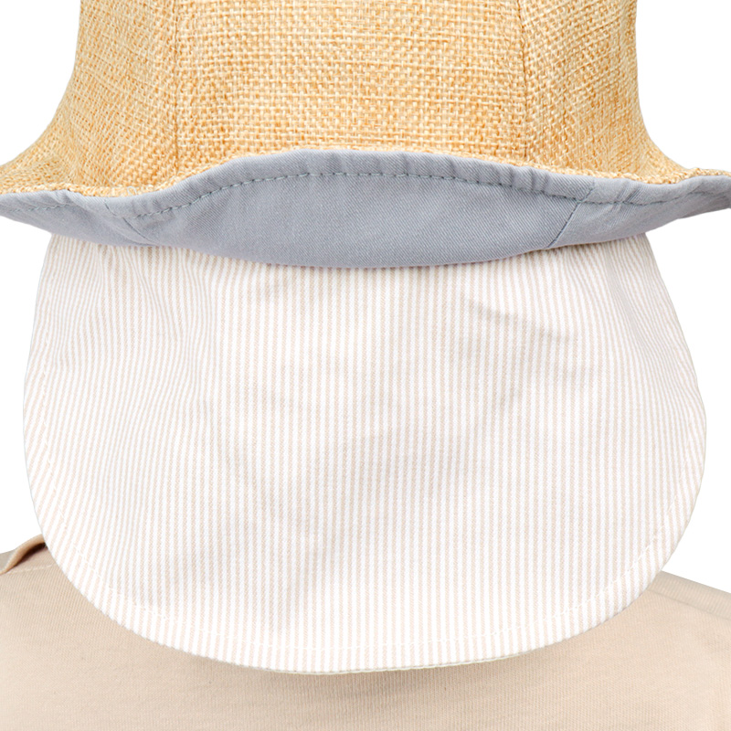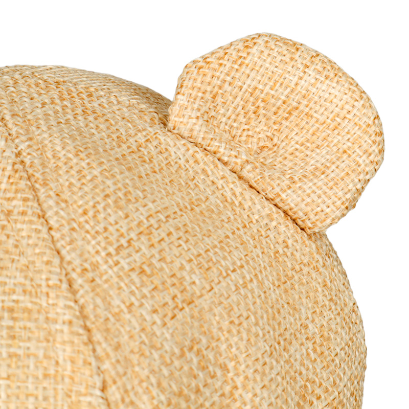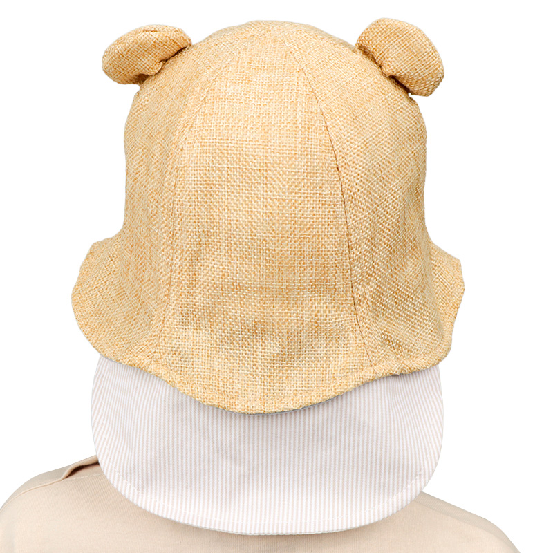 雑材の風合いがあるナチュラルな夏素材で仕上げたアイテムです。 タック入りの耳とフロント織ネームが飾る、可愛らしいくまモチーフが魅力です。 洗える素材だから、外遊び後も簡単にお手入れできます。 外での活動に嬉しい日よけ付き。 風などによる帽子の落下を防ぐアゴゴム付き。