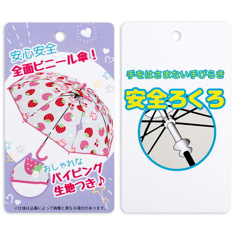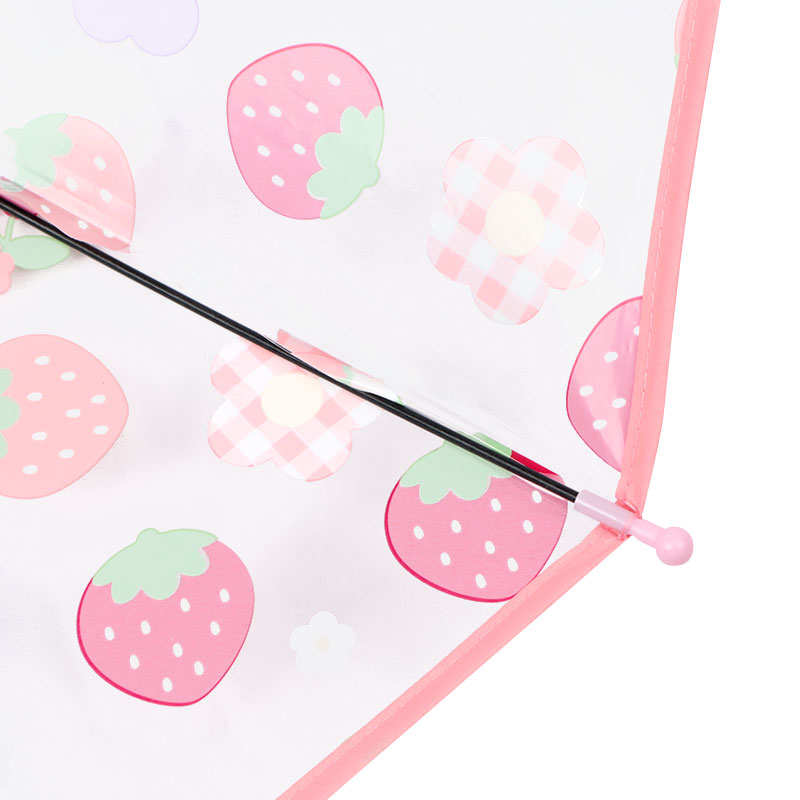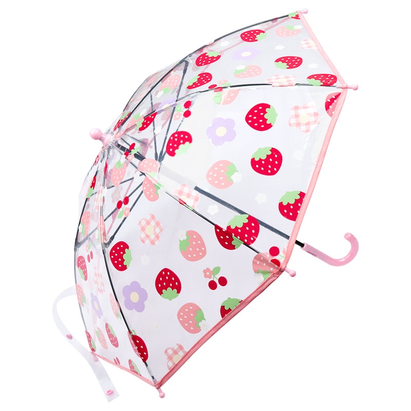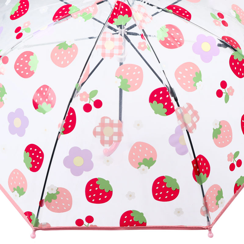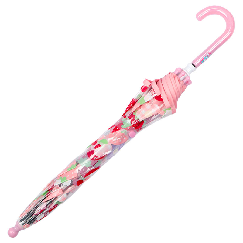 グラスファイバー骨仕様で軽くて、折れにくい。女の子に人気のお花柄です。甘くておいしそうないちごと可愛いお花柄のデザインです。きっと雨の日の通園・通学がワクワク待ち遠しくなるかわいいお花柄の傘です。
