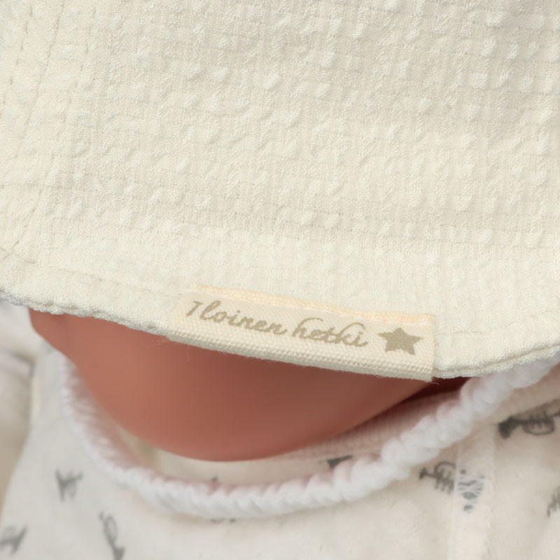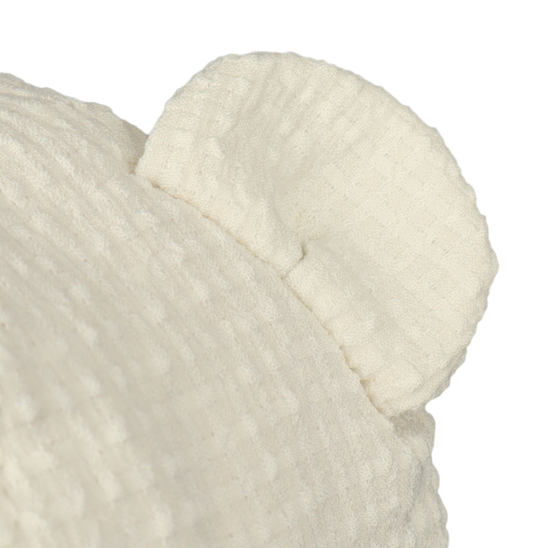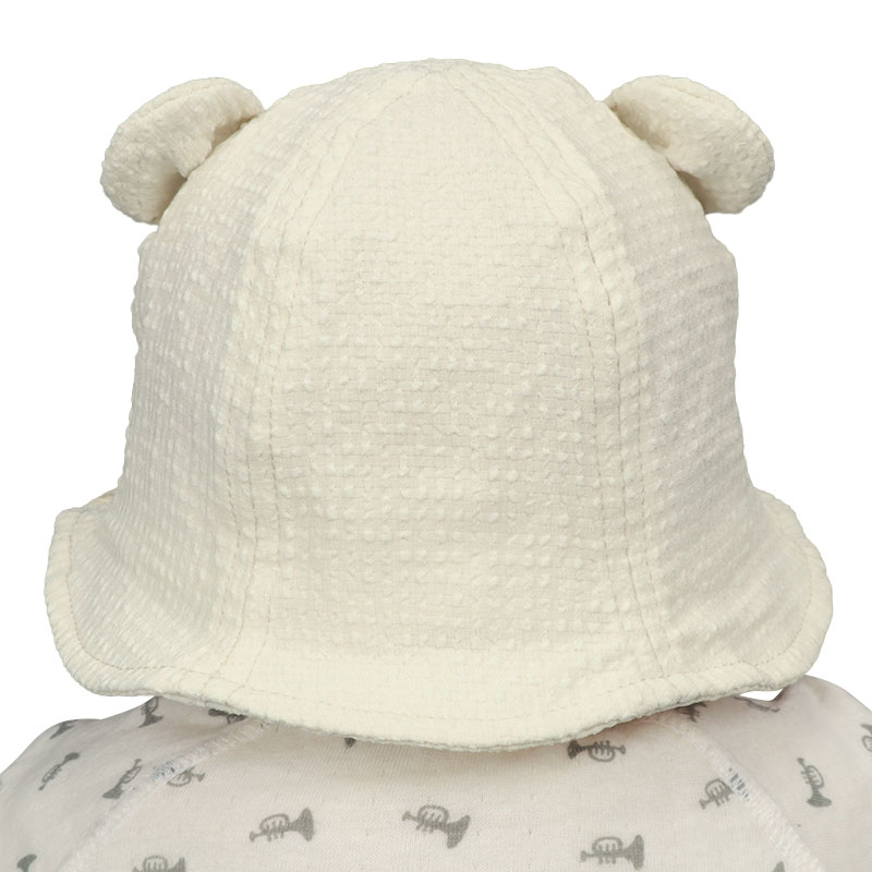 サッカー生地を使用した爽やかな風合いのアイテムです。 丸みのあるフォルムに、アニマルモチーフの耳が映えて可愛らしい。 サイドはプリントネームが飾り、こなれた印象をプラスします。 風などによる帽子の落下を防ぐアゴゴム付き。 アゴゴムは生地でくるんだ仕様なので肌あたりが優しいです。