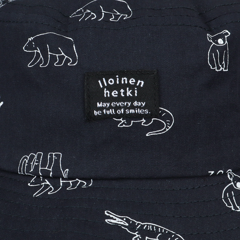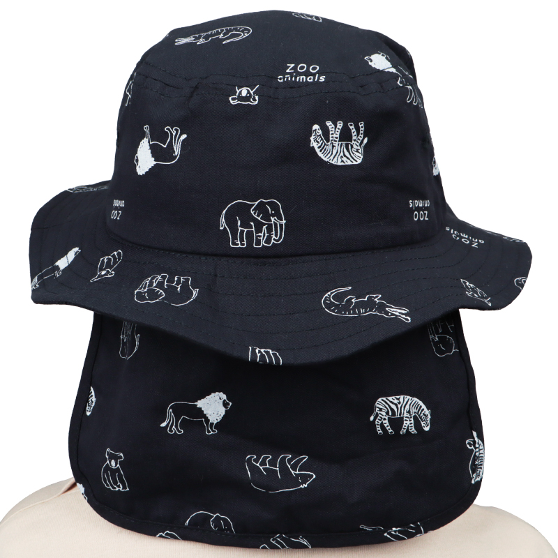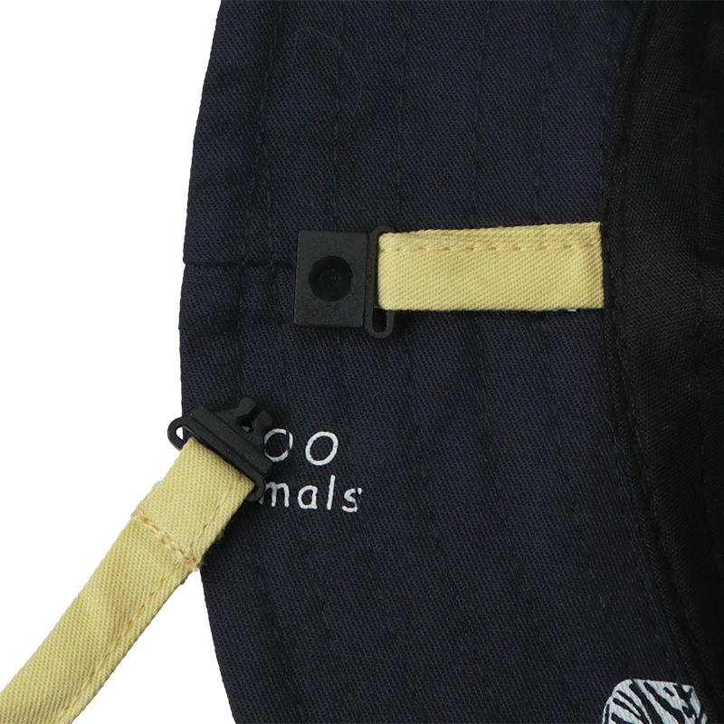 おしゃれなアニマルプリントが彩るアイテムです。 ベーシックカラーなので、コーディネートで活躍できます。 フロントは織ネームが飾り、こなれた印象をプラスします。 外での活動に嬉しい日よけ付き。 風などによる帽子の落下を防ぐ首紐付き。 首紐は、片方が、強い力がかかると外れるジョイント仕様になっています。