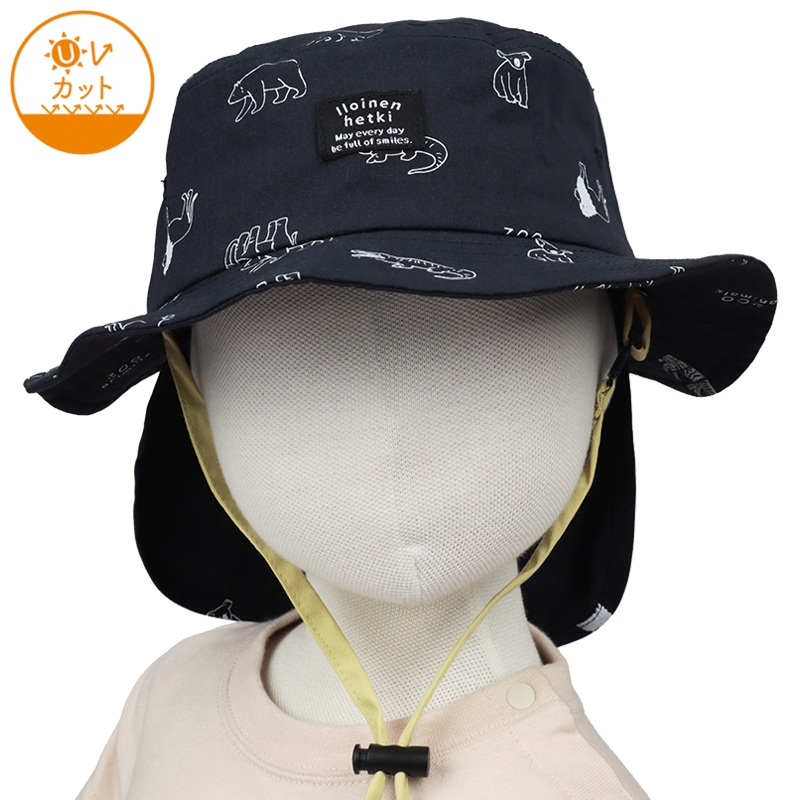 おしゃれなアニマルプリントが彩るアイテムです。 ベーシックカラーなので、コーディネートで活躍できます。 フロントは織ネームが飾り、こなれた印象をプラスします。 外での活動に嬉しい日よけ付き。 風などによる帽子の落下を防ぐ首紐付き。 首紐は、片方が、強い力がかかると外れるジョイント仕様になっています。