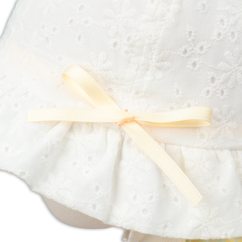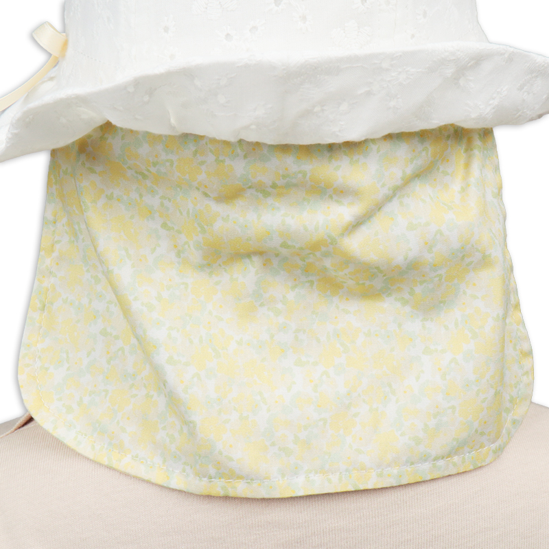 花柄素材とギャザーツバの組み合わせが可愛らしいアイテムです。 ちょこんと付いた、ねこ耳がポイント。 サイドを飾るリボンは、ほどいてサイズを調節して結べます。 外での活動に嬉しい日よけ付き。 風などによる帽子の落下を防ぐアゴゴム付き。
