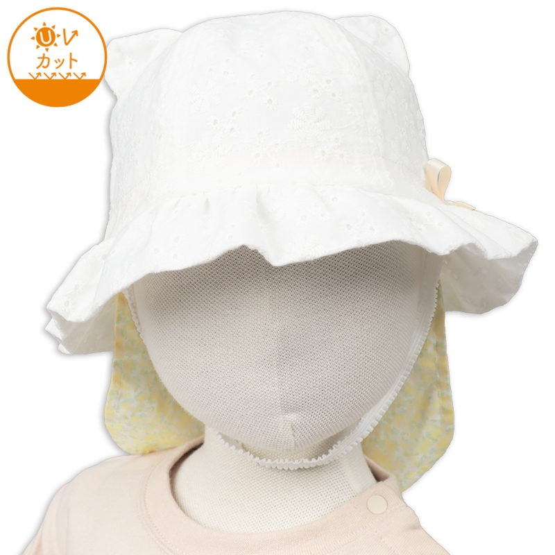花柄素材とギャザーツバの組み合わせが可愛らしいアイテムです。 ちょこんと付いた、ねこ耳がポイント。 サイドを飾るリボンは、ほどいてサイズを調節して結べます。 外での活動に嬉しい日よけ付き。 風などによる帽子の落下を防ぐアゴゴム付き。