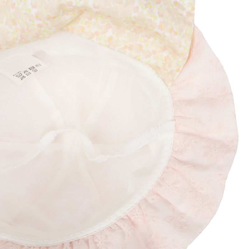 花柄素材とギャザーツバの組み合わせが可愛らしいアイテムです。