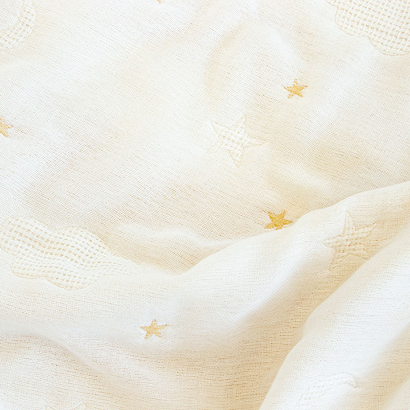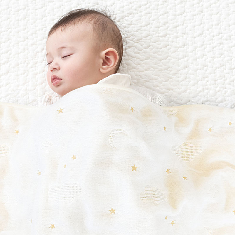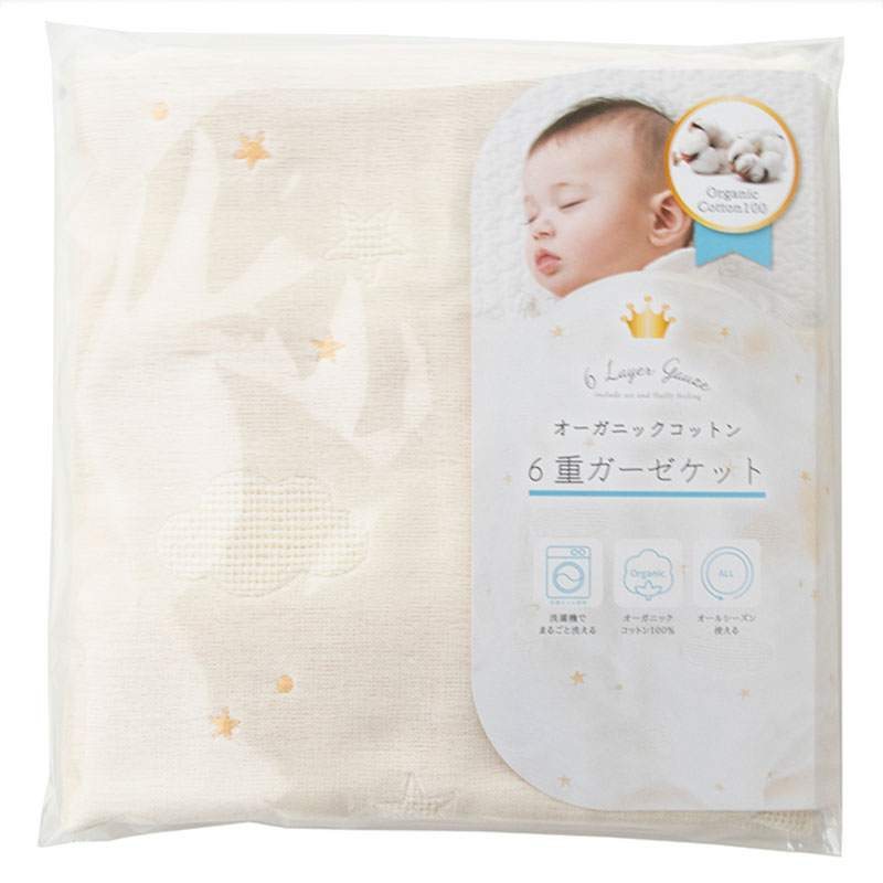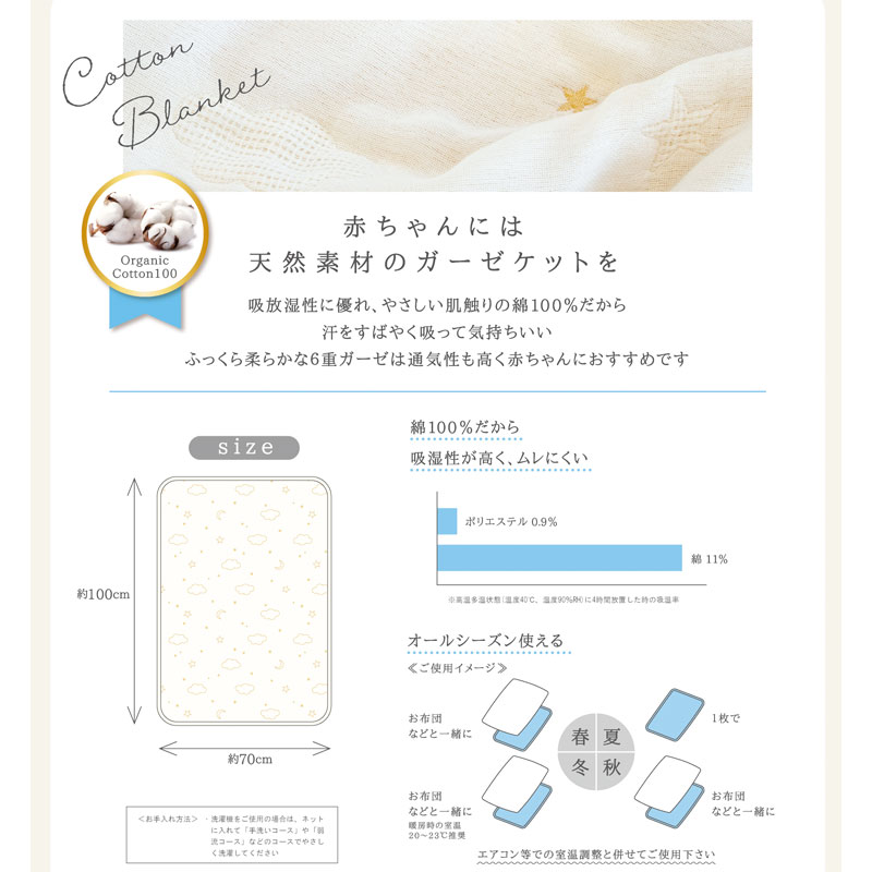 あらうたびふわふわ、肌触りが気持ちいガーゼケット。 自宅で気軽に洗濯でき、清潔に保ちやすい綿100%のガーゼを使っています。 扱いやすさだけではなく、機能面でも吸水、速乾が良く、赤ちゃんのお世話にぴったりの素材です。 6枚のガーゼを丁寧に重ねて織り、肌あたりはより柔らか。 赤ちゃんだけではなく、パパもママも実感できる気持よさです。 1枚でも、お布団と重ねても年中使えます。 ●オススメポイント 1.洗うたびふっくらする6重ガーゼ 2.オールシーズン 3.オーガニックコットンを使用