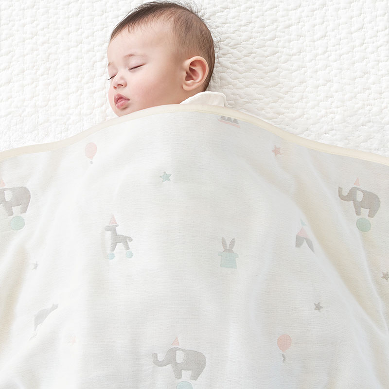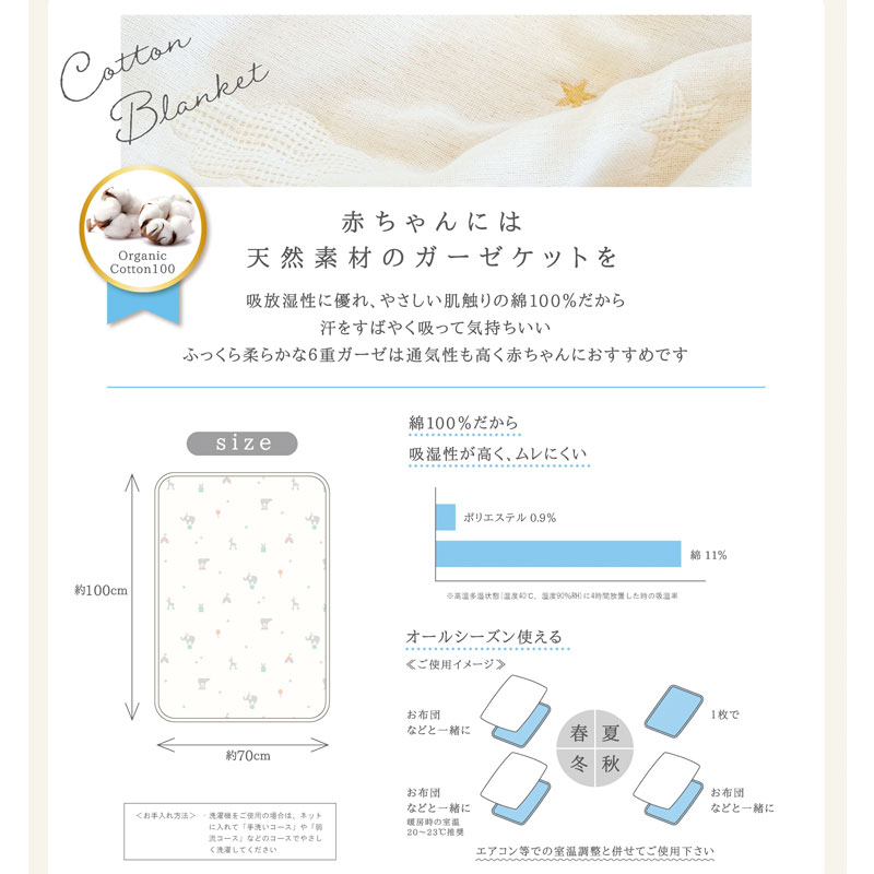 あらうたびふわふわ、肌触りが気持ちいガーゼケット。 自宅で気軽に洗濯でき、清潔に保ちやすい綿100%のガーゼを使っています。 扱いやすさだけではなく、機能面でも吸水、速乾が良く、赤ちゃんのお世話にぴったりの素材です。 6枚のガーゼを丁寧に重ねて織り、肌あたりはより柔らか。 赤ちゃんだけではなく、パパもママも実感できる気持よさです。 1枚でも、お布団と重ねても年中使えます。 ●オススメポイント 1.洗うたびふっくらする6重ガーゼ 2.オールシーズン 3.オーガニックコットンを使用