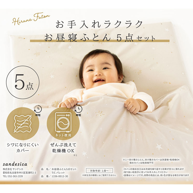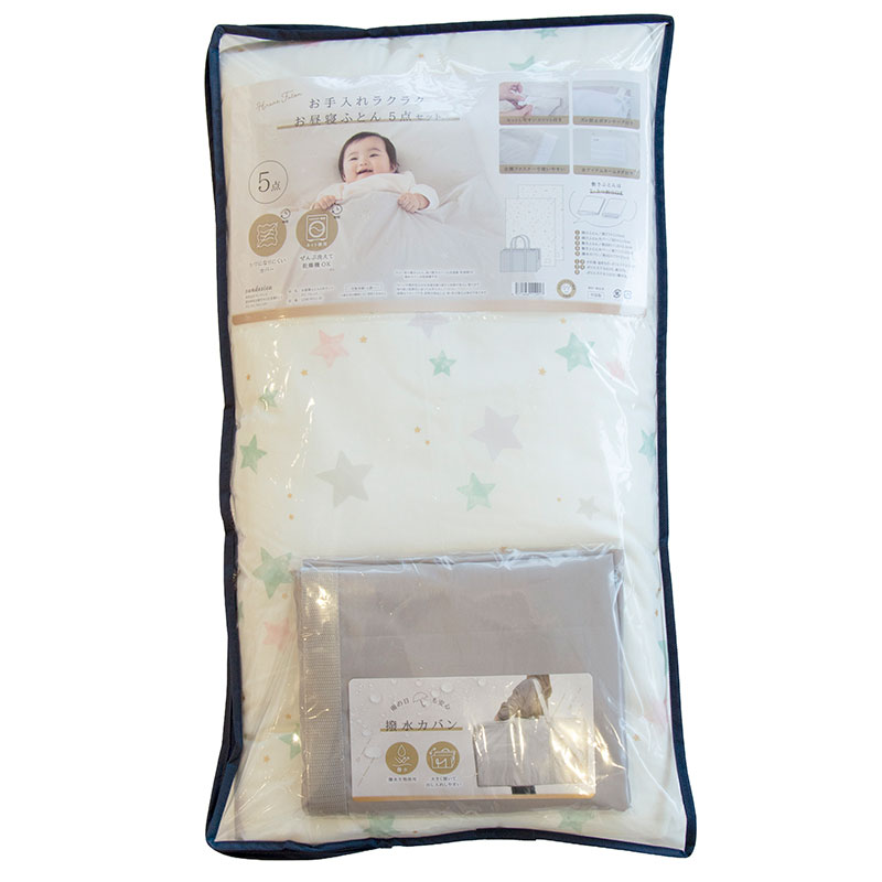 ●対象年齢:1歳~(※新生児の睡眠にはご使用いただけません) ●商品サイズ: [掛けふとん]約77×110cm [掛けふとんカバー]約80×113cm [敷きふとん]約68×118×3.5cm [敷きふとんカバー]約71×123cm [撥水カバン]約40×70×21cm ●素材: [掛けふとん]がわ地・詰めもの:ポリエステル100% [掛けふとんカバー]ポリエステル65%、綿35% [敷きふとん]がわ地・詰めもの:ポリエステル100% [敷きふとんカバー]]ポリエステル65%、綿35% [撥水カバン]ポリエステル100%(撥水加工) ●お手入れ: [掛けふとん・掛けふとんカバー・敷きふとん・敷きふとんカバー]洗濯機可(ネット使用・タンブラー乾燥不可) [撥水カバン]洗濯機可(ネット使用・タンブラー乾燥不可) ●撥水カバンについて: ・生地の表面をコーティングし、水分を玉状にはじく加工を施しています。 ・長時間水に濡れたり、水分を拭く際に押し付けてしまうと水分が内側に浸透します。 ・水分は出来るだけ早く、タオル等に吸収させてください。 ・また、撥水効果は徐々に薄れていきます。 ・効果を継続させたい場合には市販の撥水スプレー等をご使用頂くことをおすすめします。
