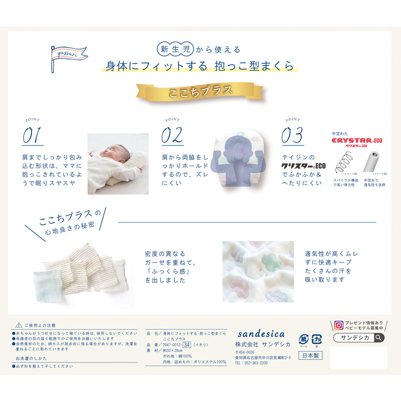 肩までしっかり包みこむ形状は ママに抱っこされているようで眠りスヤスヤ。 U字形状でしっかりフィットしてズレにくい 6層にふっくら織ったガーゼ生地により、通気性が高くムレずに快適キープ。 たくさんの汗を吸い取ります。 ●オススメポイント 1. 肩までしっかりと包み込む形状 2. 肩から両脇をしっかりとホールドするので、ズレにくい 3. 6重ガーゼ仕様により通気性、吸水性が高い