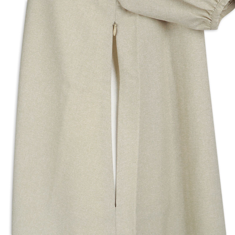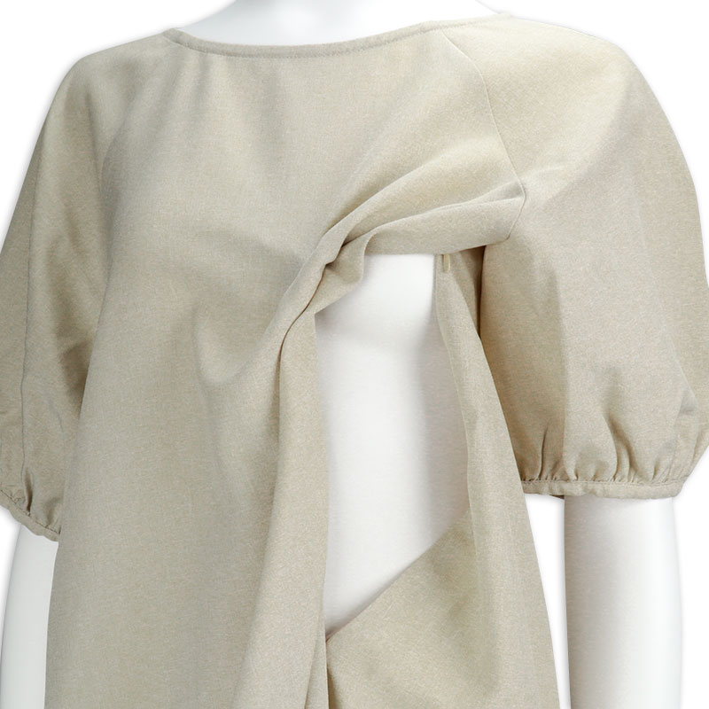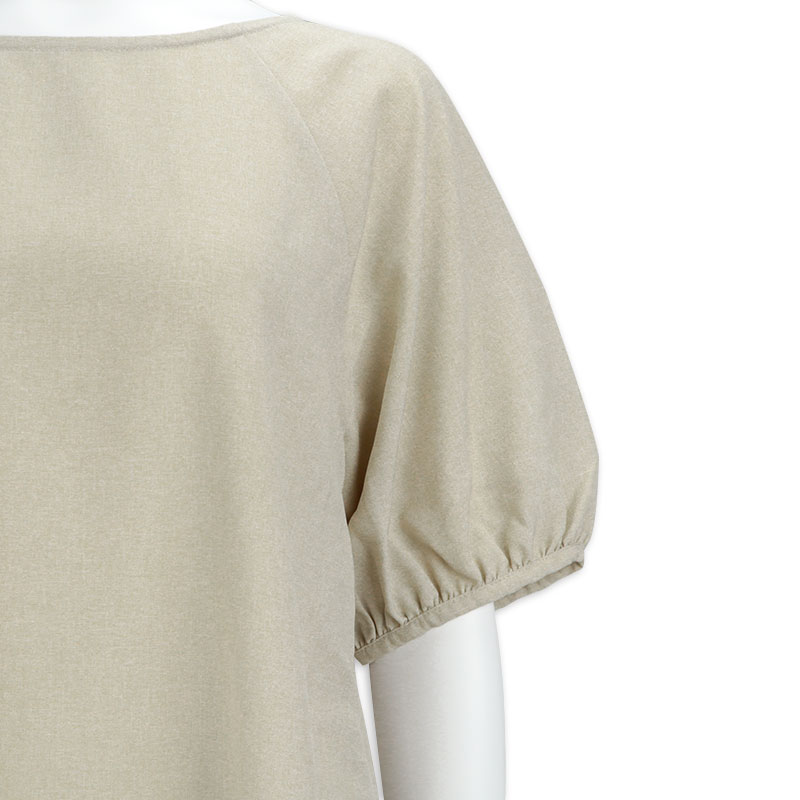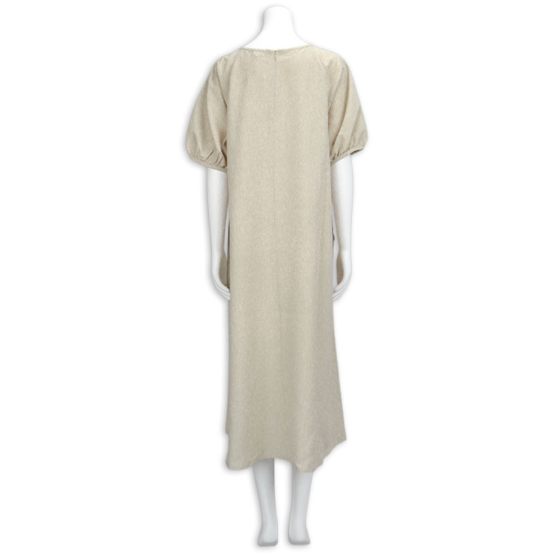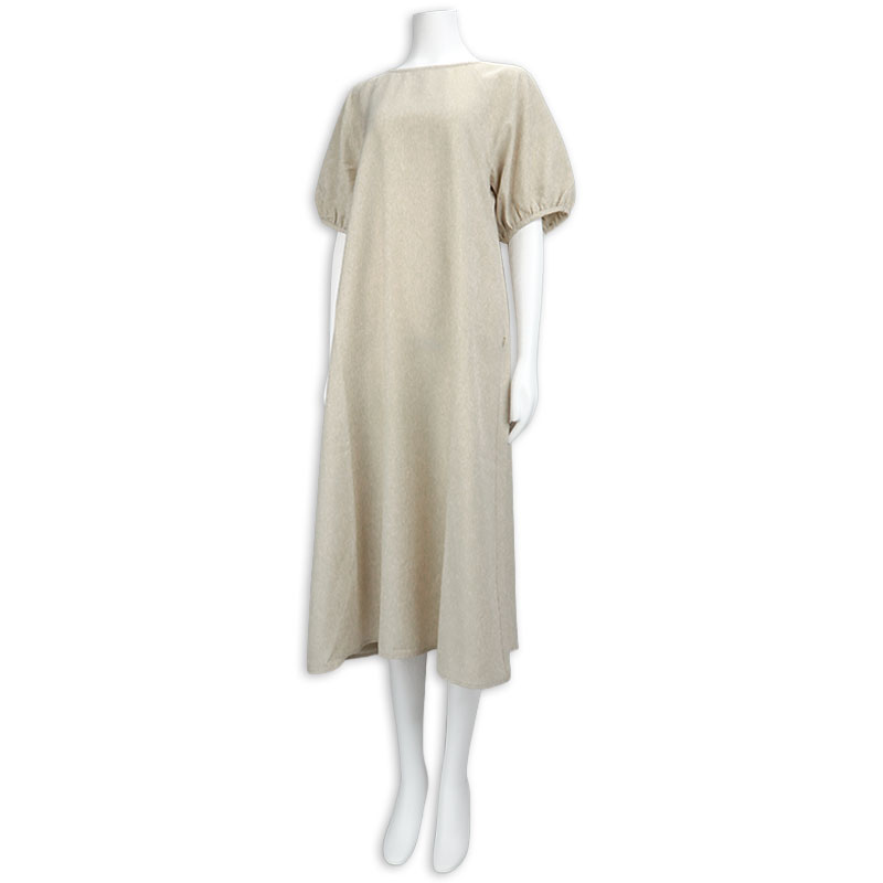 ふんわりとしたバルーンスリーブが女性らしい印象を与えるワンピースです。ラグランスリーブ仕様で肩まわりを優しく包み込み、動きやすさとリラックス感を兼ね備えたデザインです。身頃両脇に授乳口ありです。シワになりにくい生地で、通勤お出掛けにもお勧めです。1枚で上品なスタイリングが完成するので、忙しいママにお勧めです。UVカットと接触冷感機能付き。