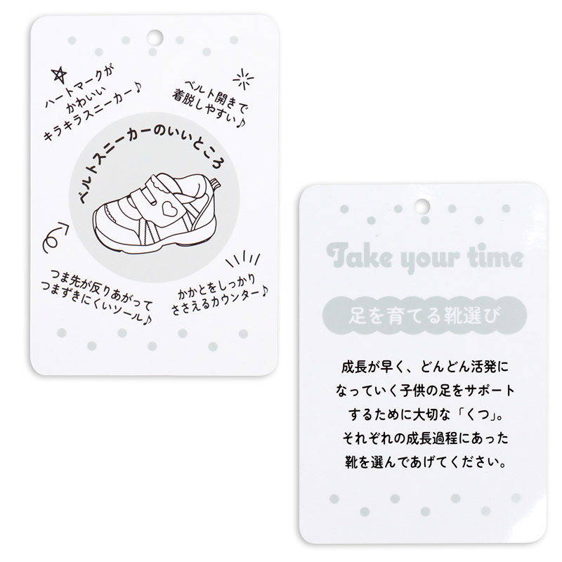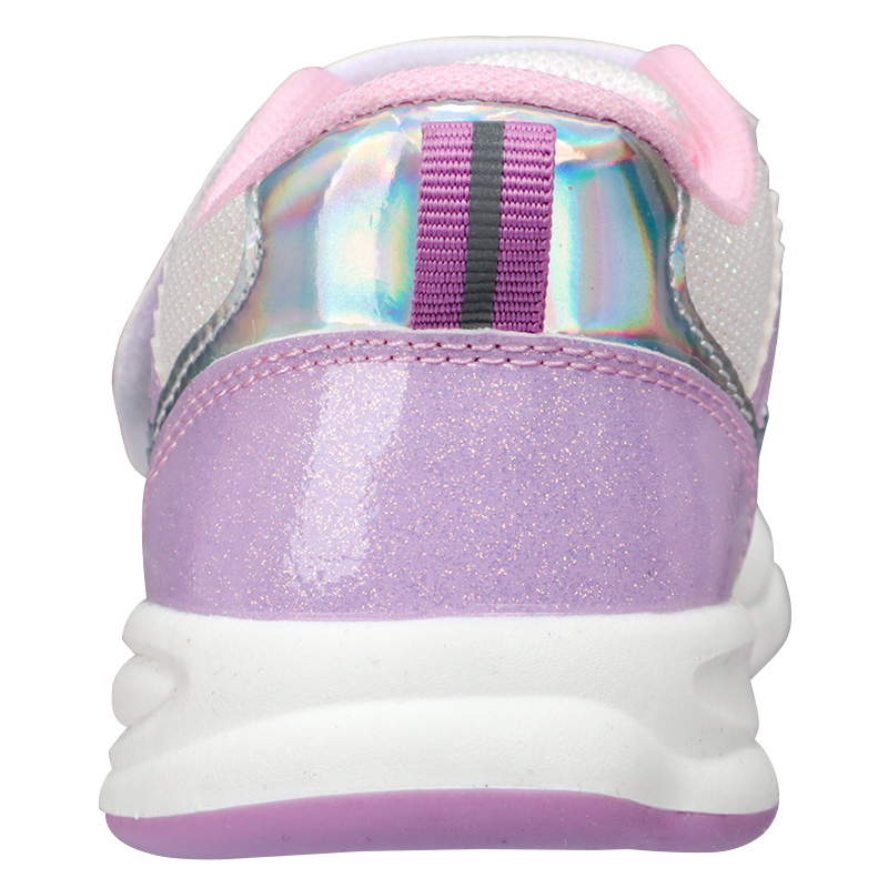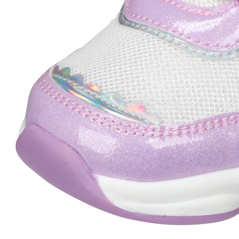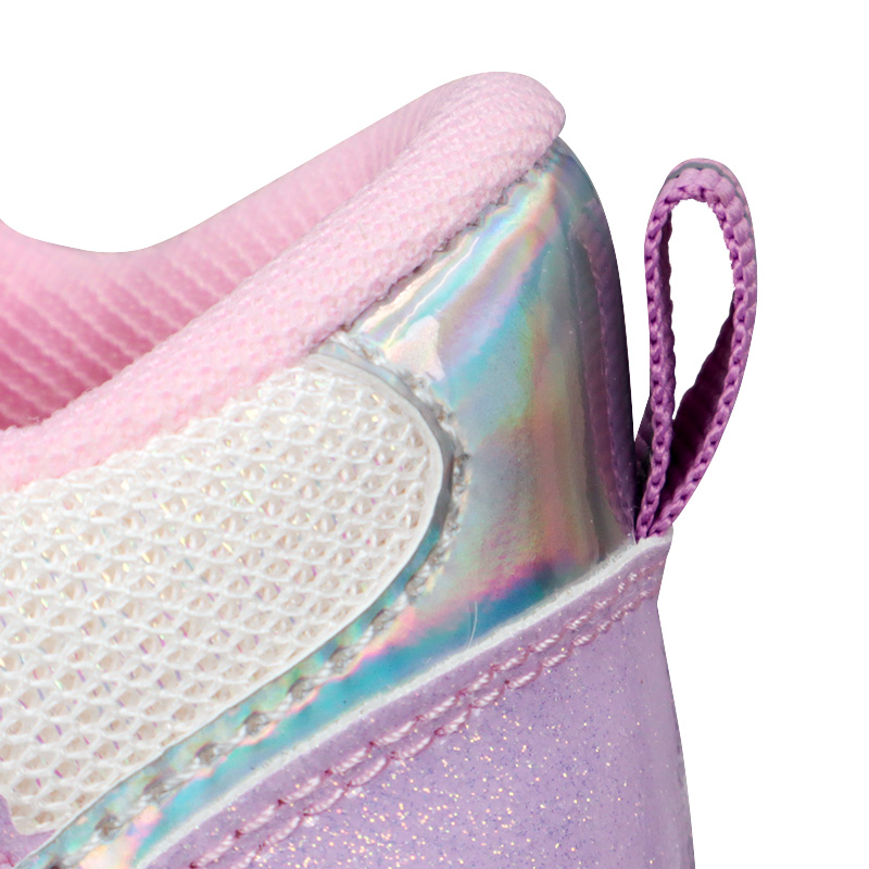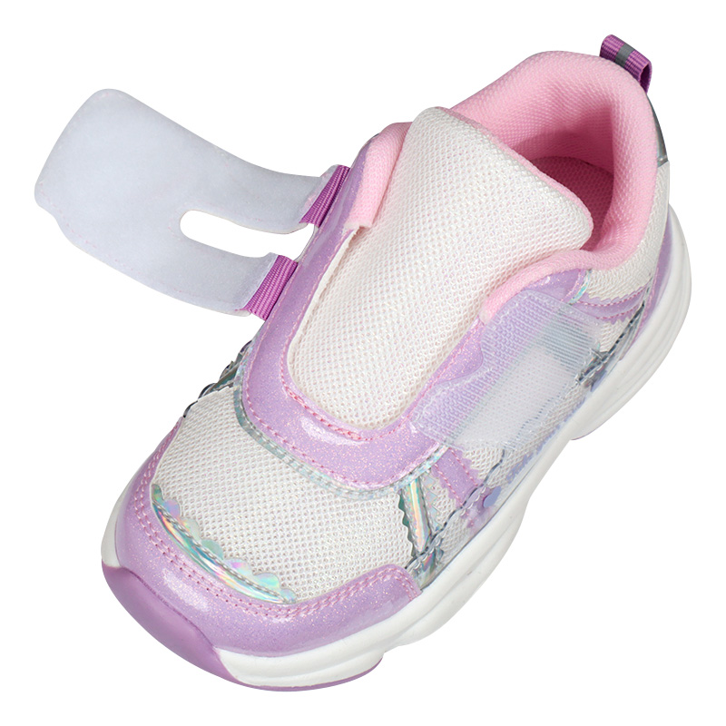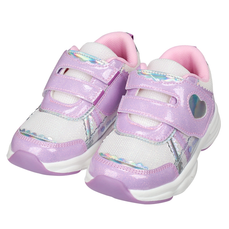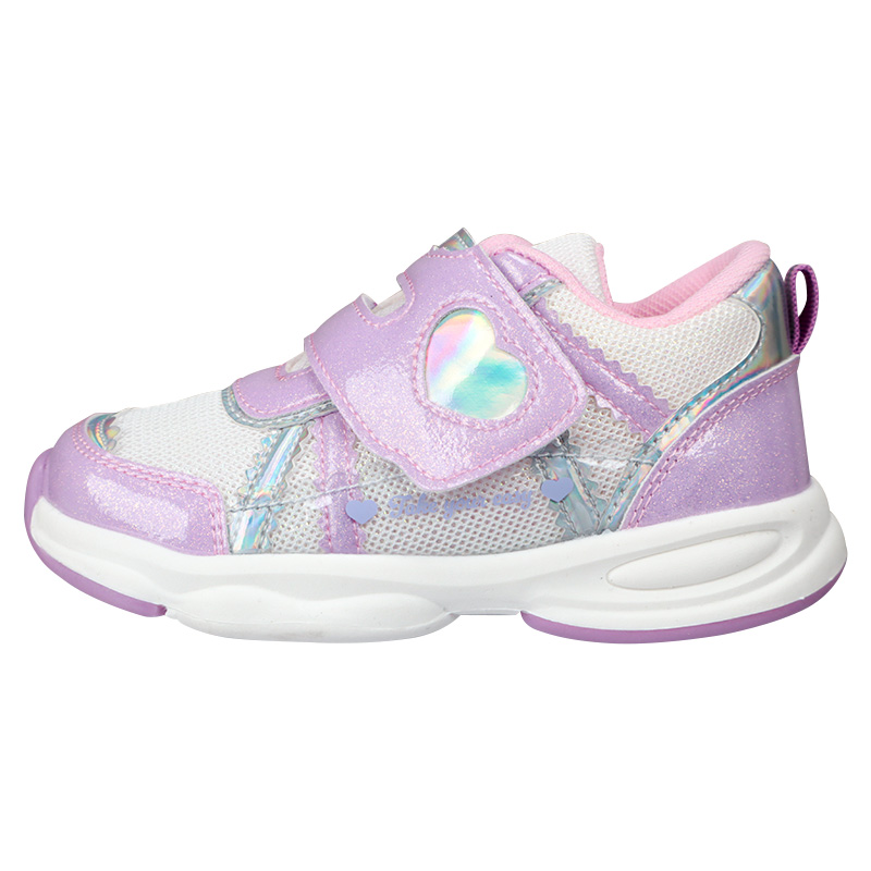 キラキラした配色が特徴。お出かけが楽しくなると思います。通気性の良いメッシュ素材でムレにくく、通園や公園遊び、お出かけなど色々な場面に活躍できる1足です。履き口が大きく開くワンベルトで、脱ぎ履きしやすいのもポイントです。