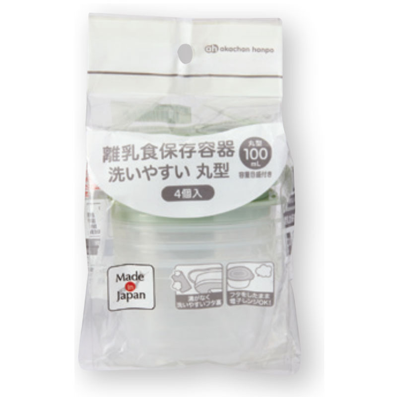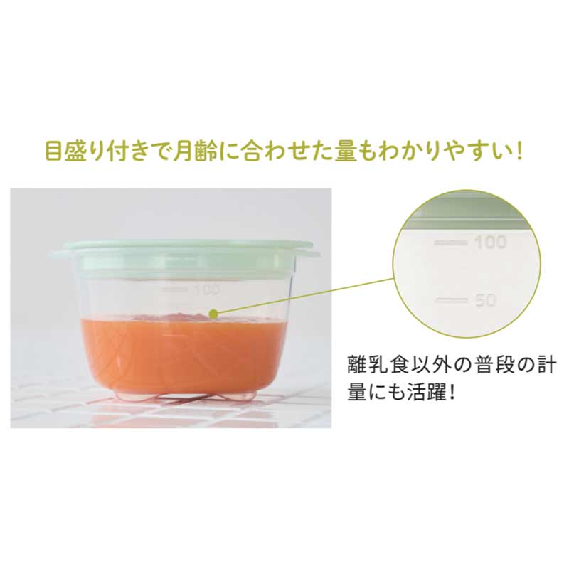 ●溝がなく洗いやすいフタ裏 ●フタをしたまま電子レンジOK ●丸型の離乳食保存容器