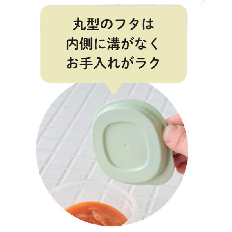 ●溝がなく洗いやすいフタ裏 ●フタをしたまま電子レンジOK ●丸型の離乳食保存容器