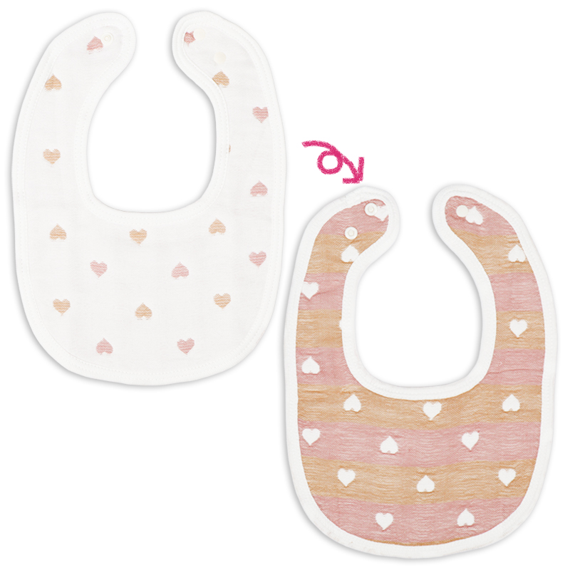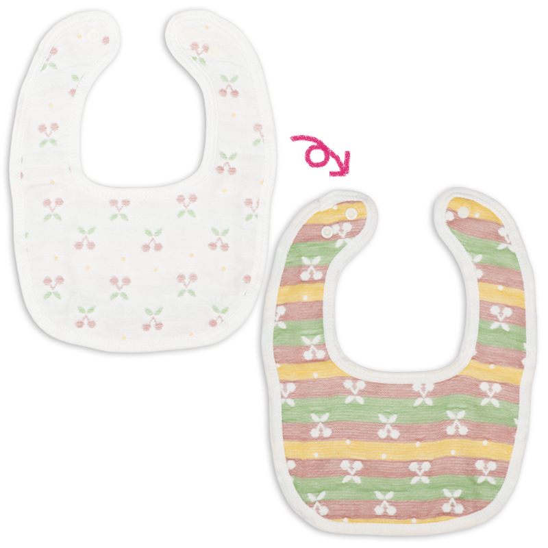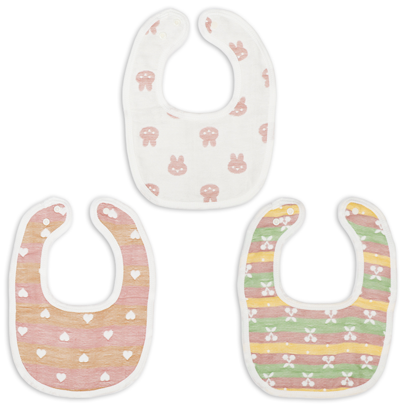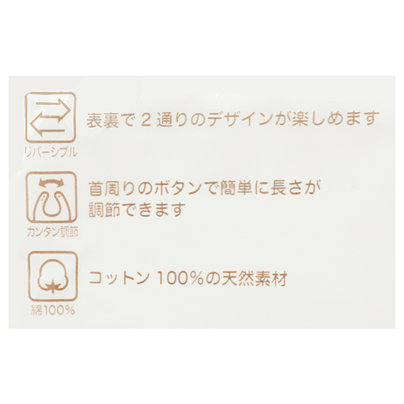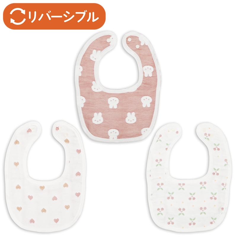 リバーシブルタイプ。 首まわりのボタンで長さの調節も簡単。 吸水性や通気性のよい、お肌にやさしいガーゼ素材。 洗い替えにうれしい3枚組。
