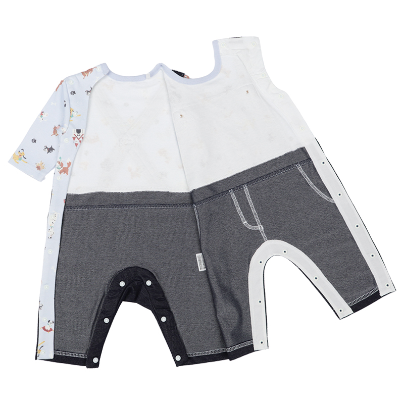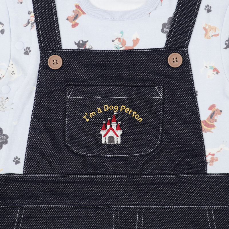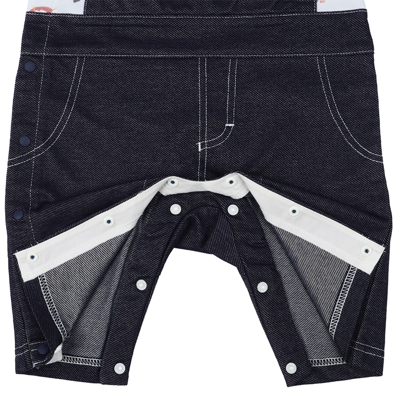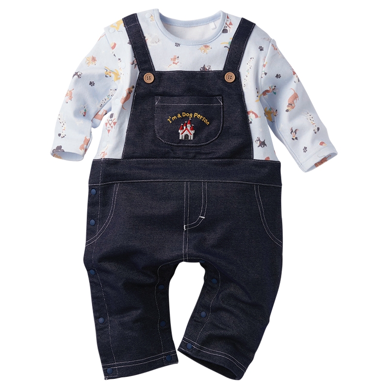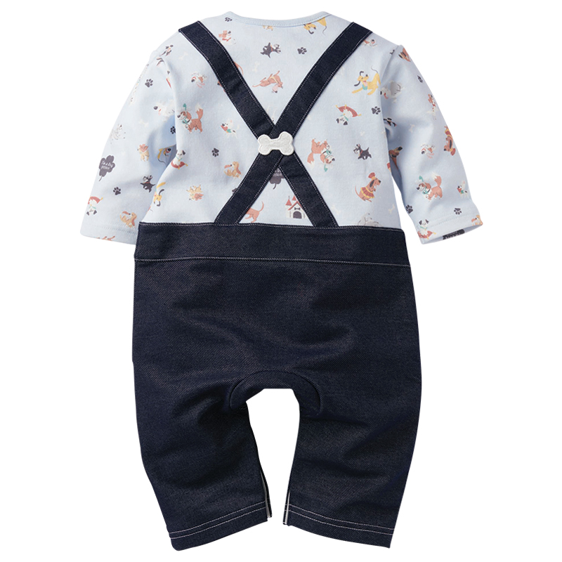 中国製 ●素材= 本体 綿100% デニムニット部分 綿67% ポリエステル27% ポリウレタン6% ●サイズ(約・cm)= 60(身丈52・身幅25・袖丈17.5・股上37・股下15) 70(身丈56・身幅26・袖丈20.5・股上39・股下17) 80(身丈60・身幅27・袖丈23.5・股上41・股下19) ?Disney