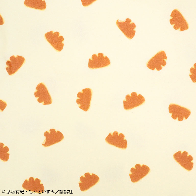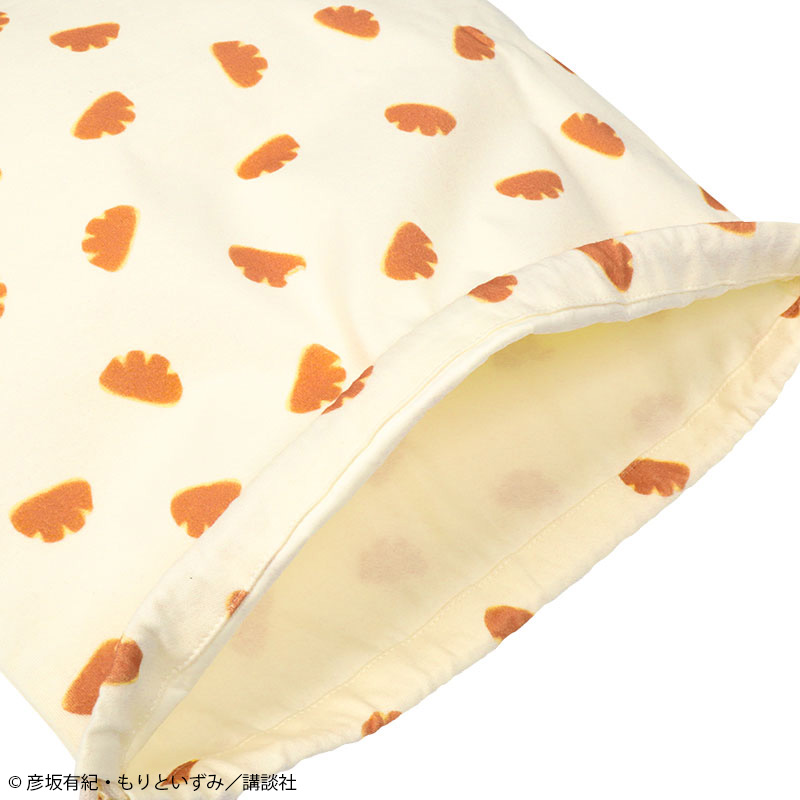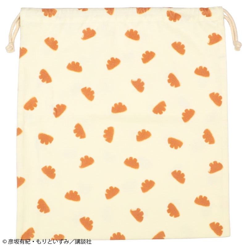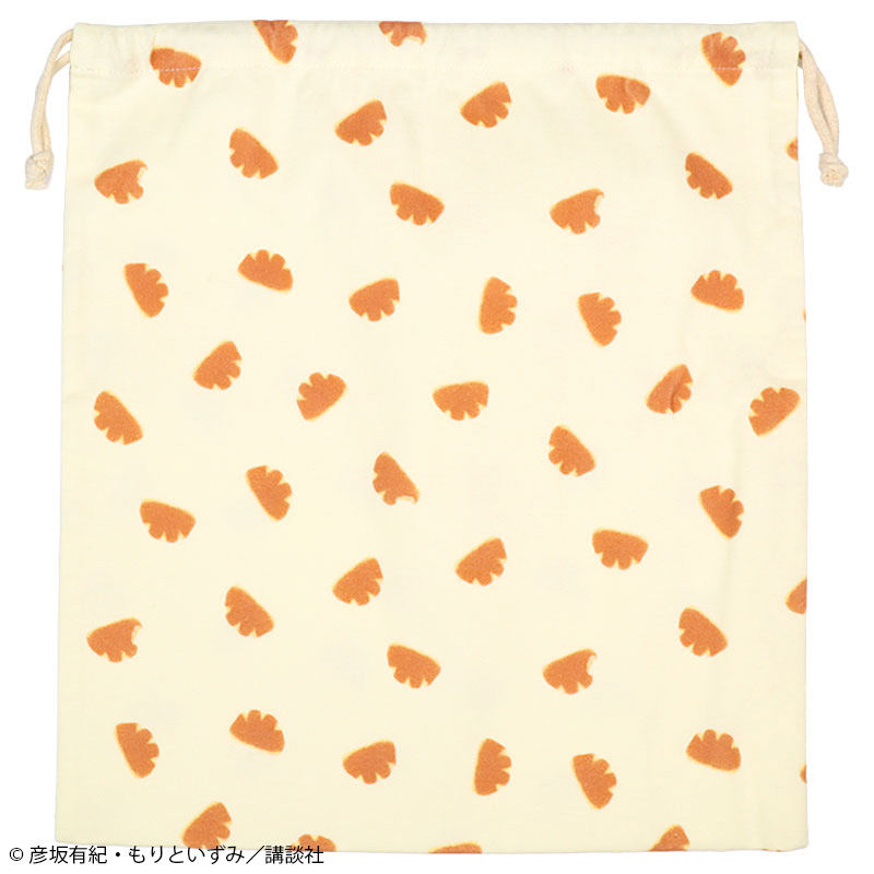 絵本「パンどうぞ」の巾着です。 通園通学の小物をたくさん入れられるLサイズ。 クリームパンの総柄が目を惹くデザインです。 素材は綿100%のスムース素材、表面がなめらかでやわらかい肌触り。 お名前ネーム付き。