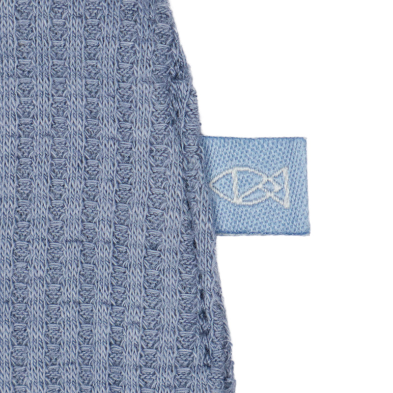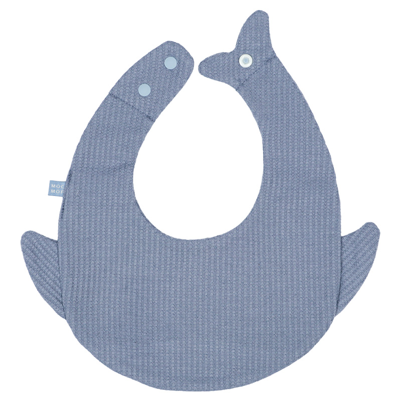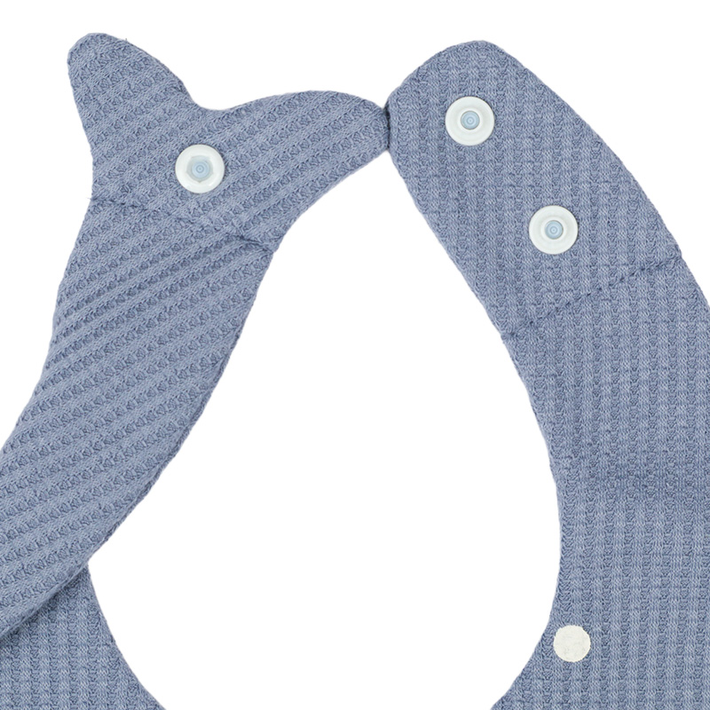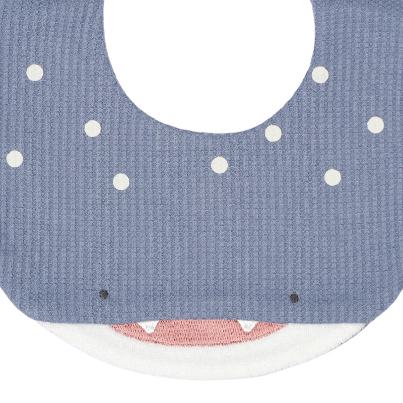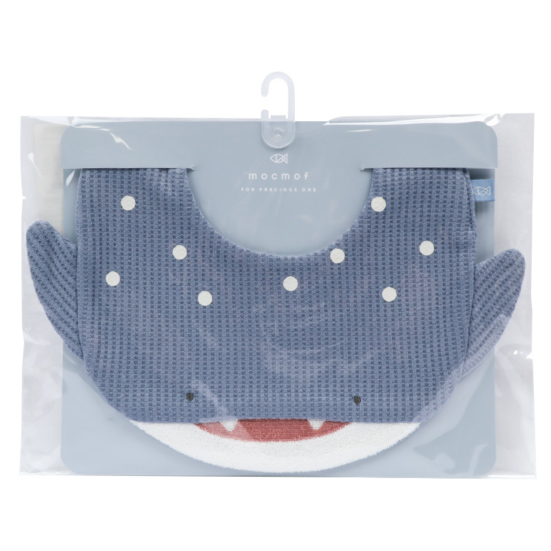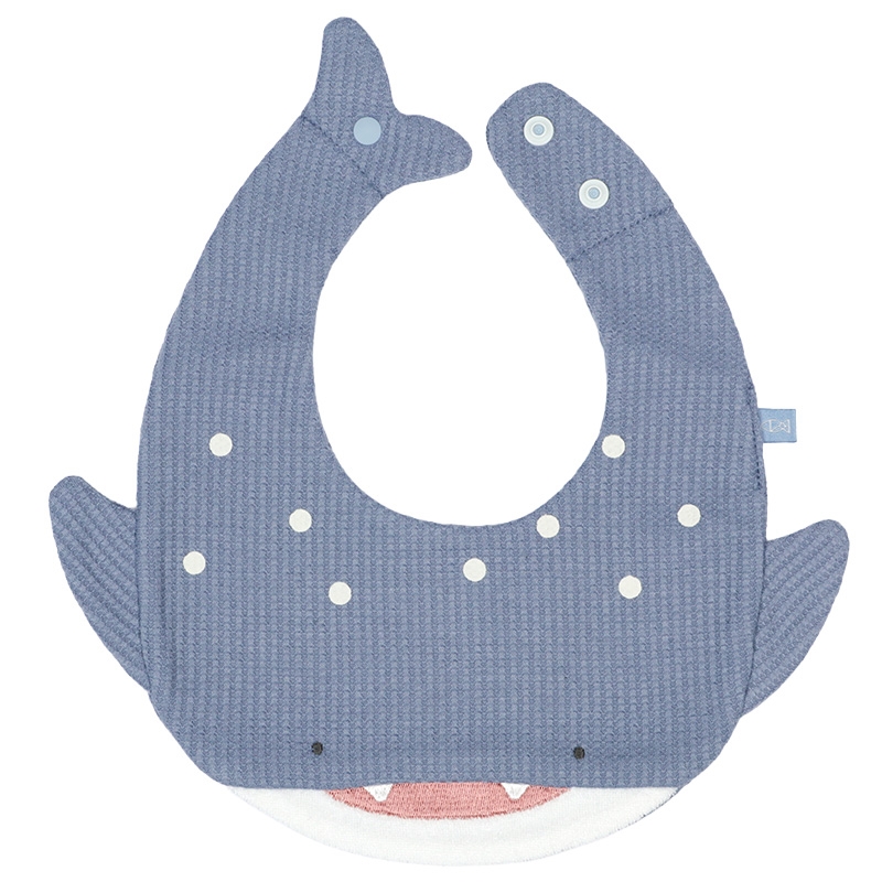 ジンベイザメの水族館スタイは、表情やシルエットなど、細部にまでこだわったデザインです。 スタイの首先はしっぽの形になっているので、着用した時の後ろ姿もかわいいです。 肌触りの良いワッフル生地を使用し、ベビーの肌に優しく仕立てました。 首周りはスナップボタンで2段階のサイズ調節が可能です。
