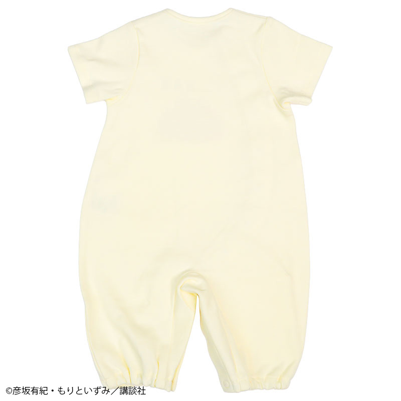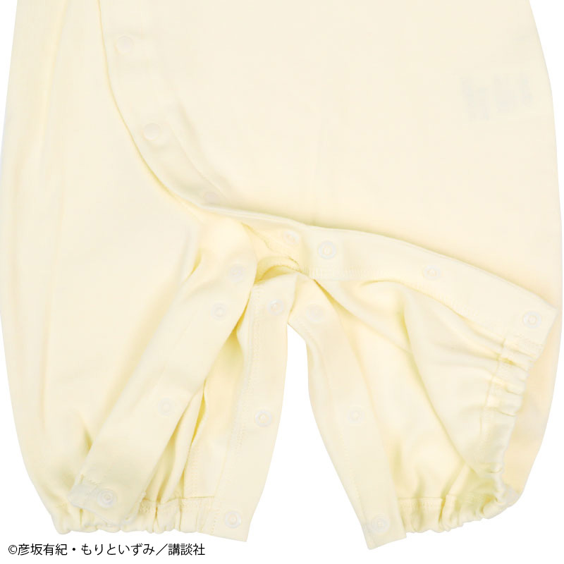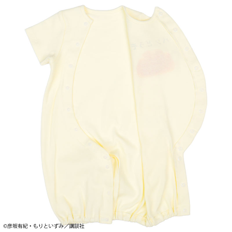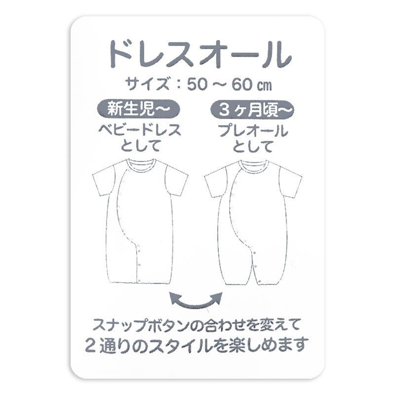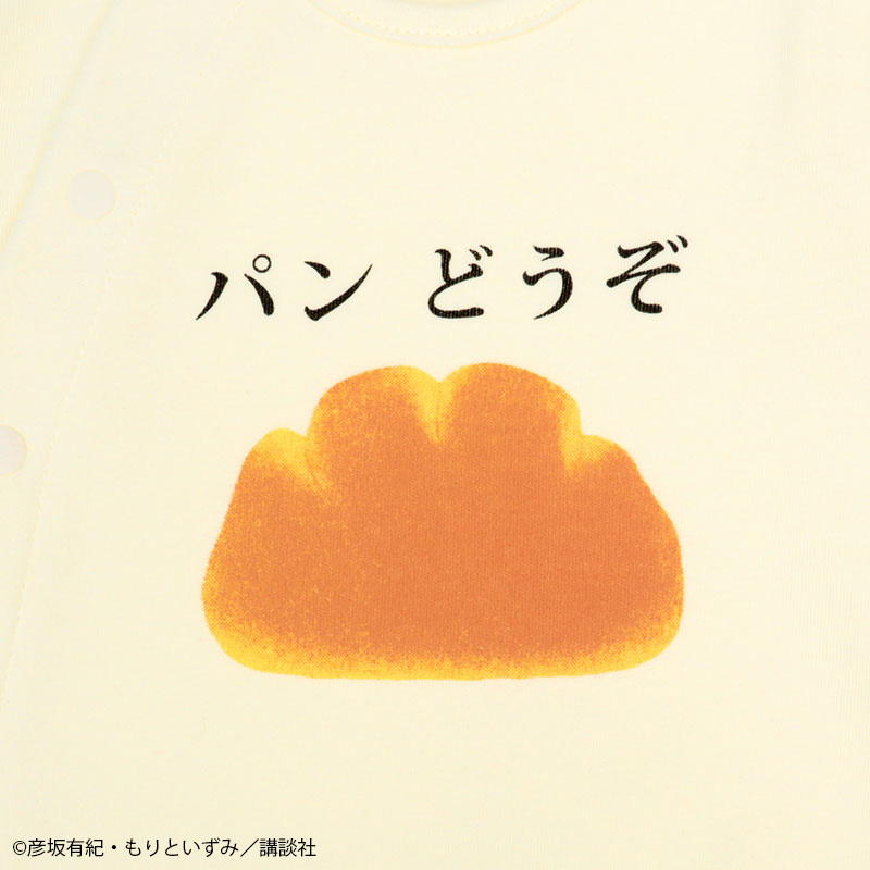 絵本「パンどうぞ」のドレスオールです。 大きなクリームパンが目を惹くデザインです。 素材は綿100%のスムース素材、表面がなめらかでやわらかい肌触り。 スナップボタンの合わせを変えれば、ドレスオールとプレオールの2WAYの着用ができます。