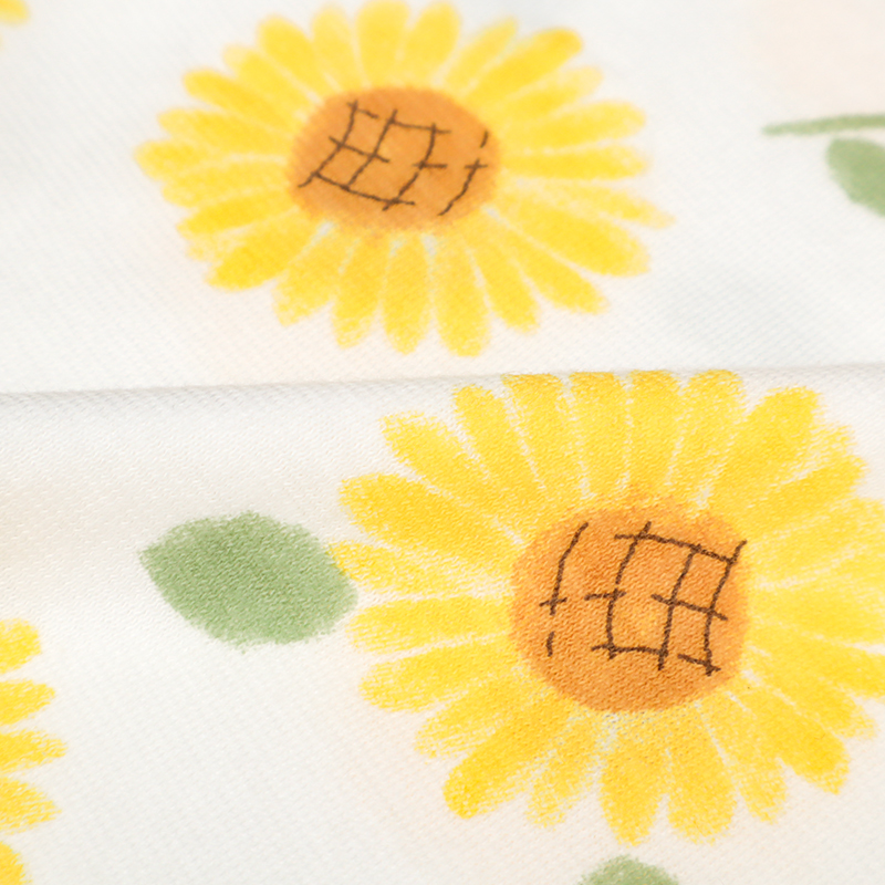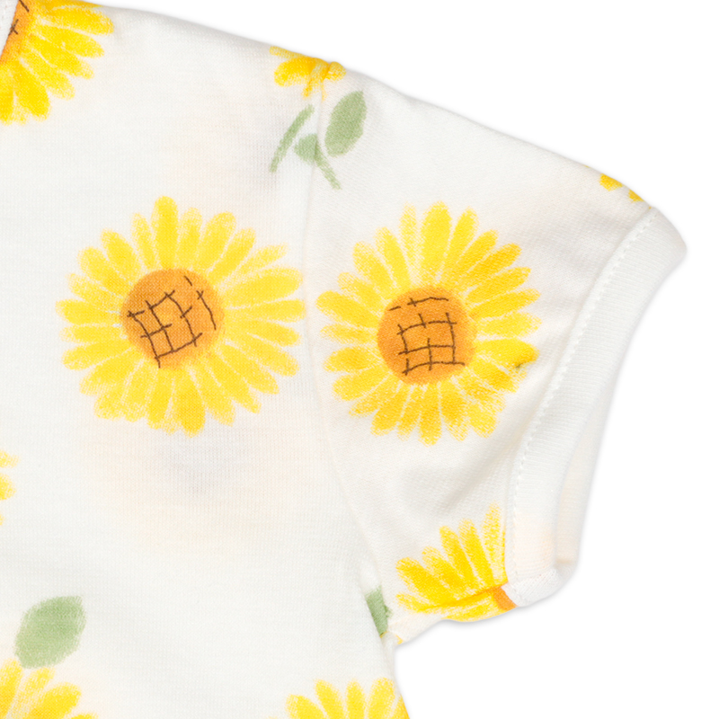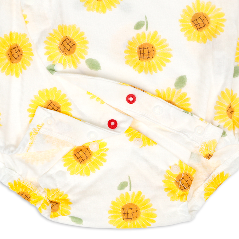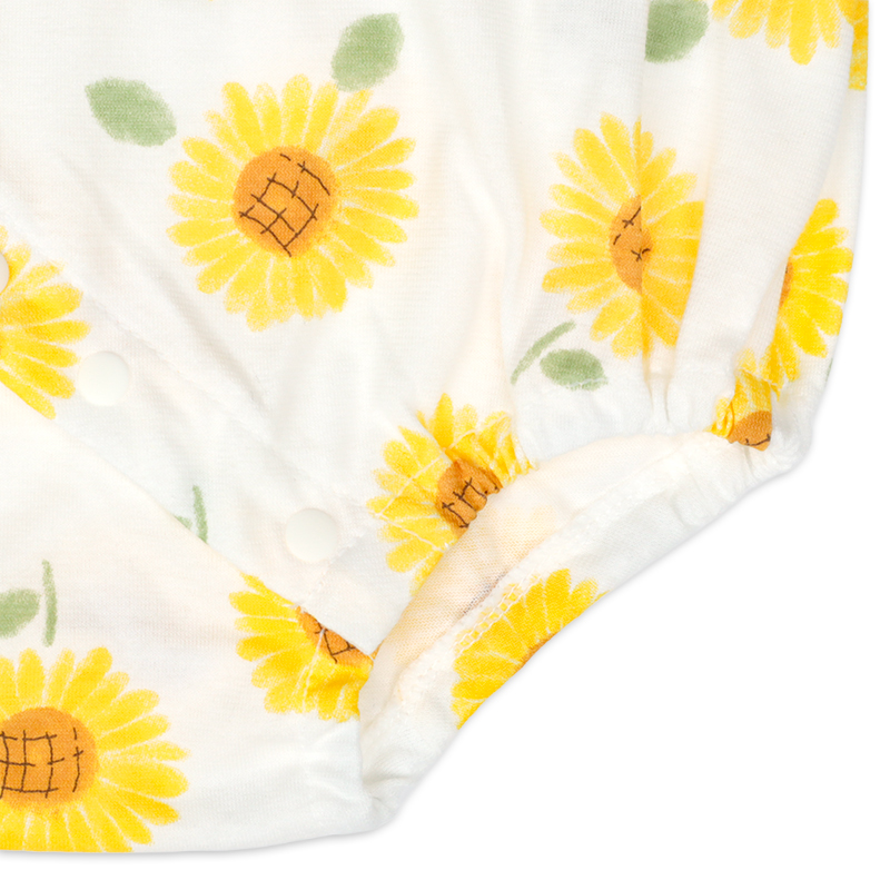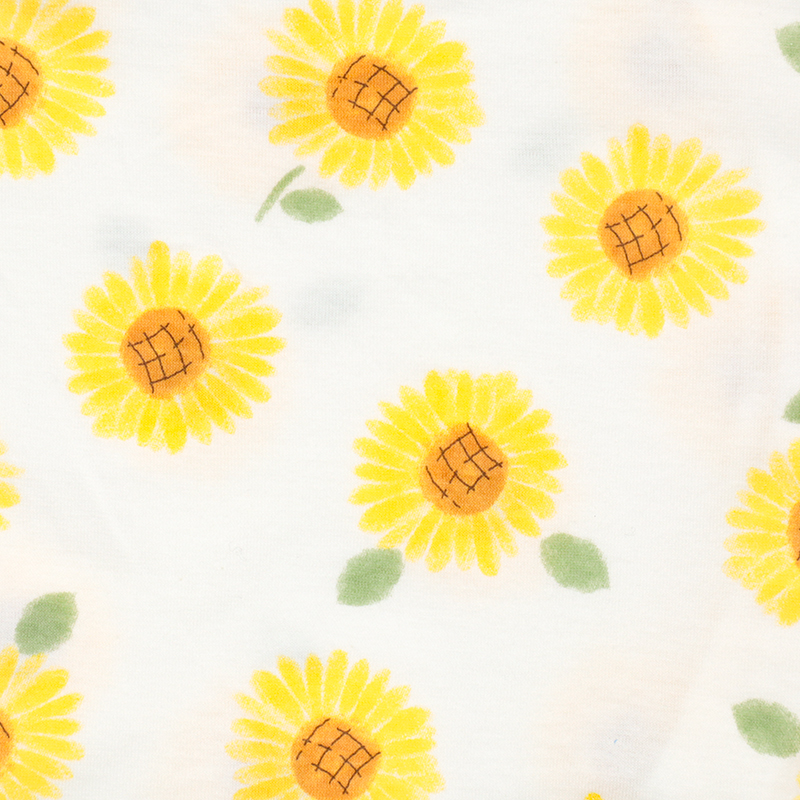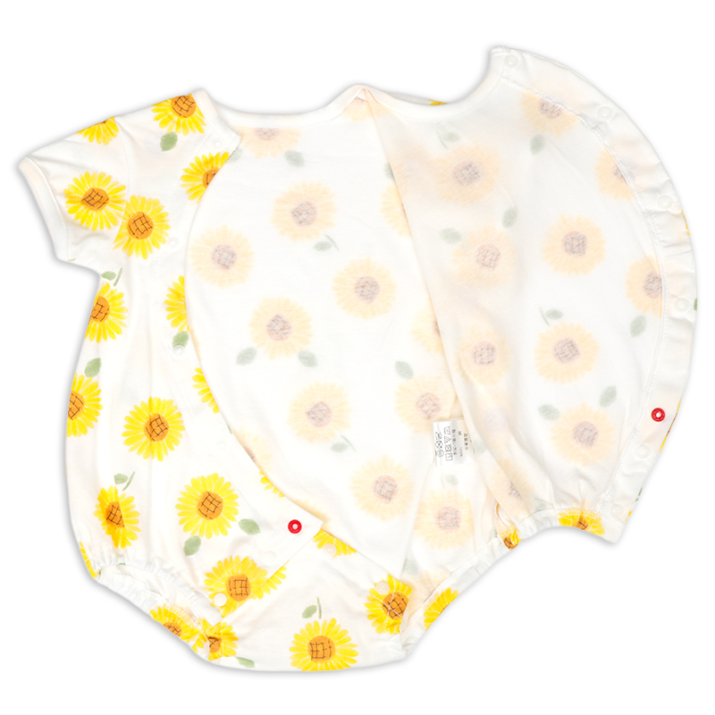 まるくてかわいいシルエットのひまわり柄のプレオールです。日本国内で編みたてられた綿100%の天竺素材を使用したこちらの商品は通気性や肌触りがよく、吸湿性に優れています。また軽くて薄いので気温の高い夏の時期の着用に適しています。あんよを動かしやすいように足回りがゴムになっており、活発な赤ちゃんの動きを妨げません。