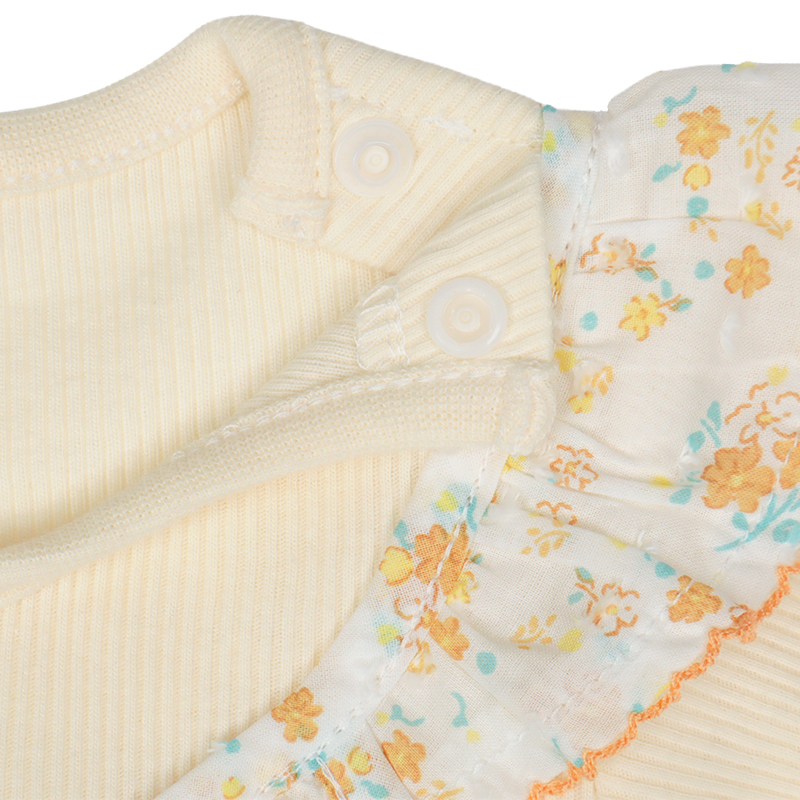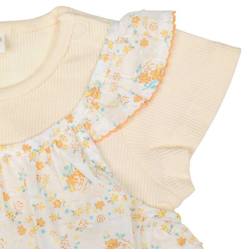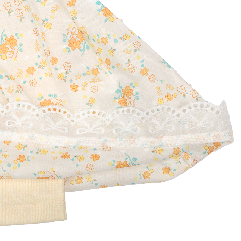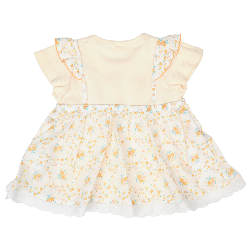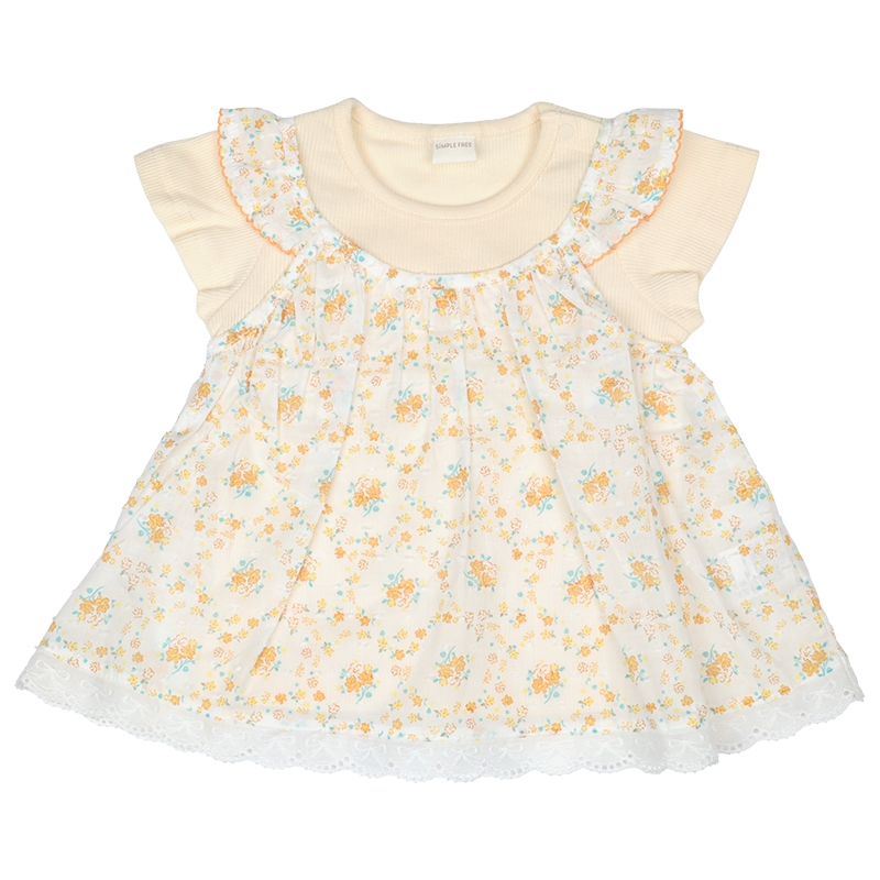 ●素材=Tシャツ部 綿60% ポリエステル40%/衿刳り部 綿57% ポリエステル40% ポリウレタン3%/スカート部 綿100% ●サイズ(約・cm)= 80(着丈34 身巾27 袖丈8 裾巾55) 90(着丈36 身巾28 袖丈8 裾巾57) 95(着丈38 身巾29 袖丈9 裾巾60)
