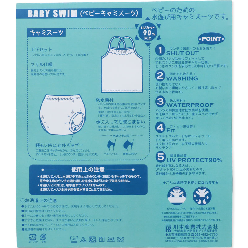 太もも周りは立体ギャザーになっているのでコロコロウンチをキャッチ (吸水性はありませんのでおしっこは吸水しません。) 布製の赤ちゃん用水着なので繰り返し洗って使用出来て経済的 布おむつを挟めばおむつカバーとしても使用できます