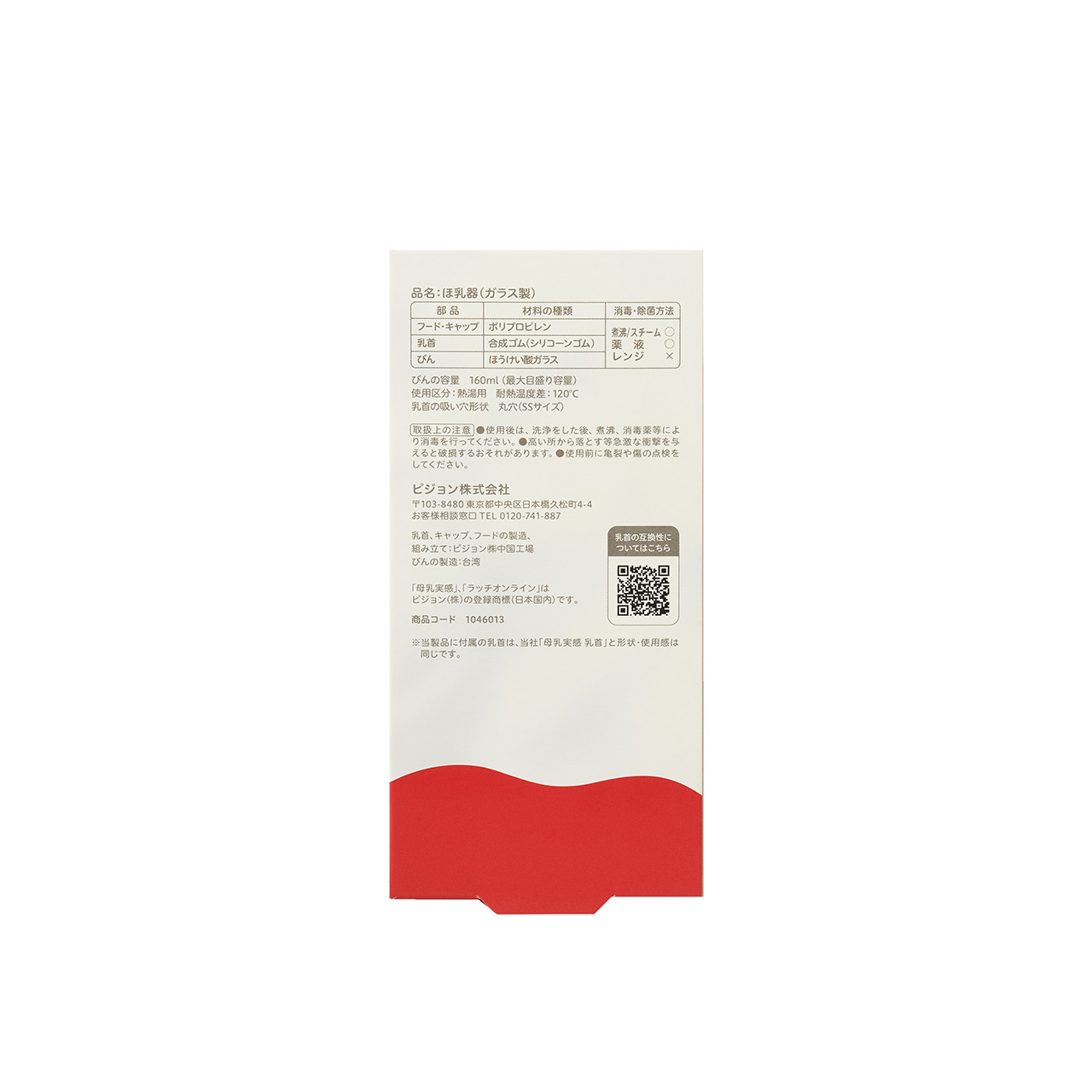 ●容量:160ml ●対象月齢:0カ月から ●素材:耐熱ガラス製 ●付属乳首:シリコーンゴム製 SSサイズ(丸穴) ■消毒・除菌方法 煮沸/スチーム:○ 薬液:○ レンジ:× ■使用上の注意 ・使用区分:熱湯用 ・耐熱温度差:120℃ ・使用後は、洗浄をした後、煮沸、消毒薬等により消毒を行ってください。 ・高い所から落とす等急激な衝撃を与えると破損するおそれがあります。 ・使用前に亀裂や傷の点検をしてください。 ・ガラス製哺乳びんは割れものです。落とす、ぶつけるなどの衝撃が加わると割れます。 ケガの原因になりますのでご注意ください。 ・調乳時、哺乳びんも熱くなります。ヤケドにご注意ください。 ・詳細は添付の取扱説明書をご参照ください。 ■お取替えの目安 ・ひとつの乳首に赤ちゃんがなじむと、新しい乳首に替えてもイヤがることがあります。 乳首は2個以上を交互に約2ヵ月をめどに使ってください。 破れたり切れたりしないように、古くなったら使用回数にかかわらず、早めに取り替えましょう。 ・乳首は歯の生えている赤ちゃんが、かんで引っ張ると裂けることがありますのでご注意ください。