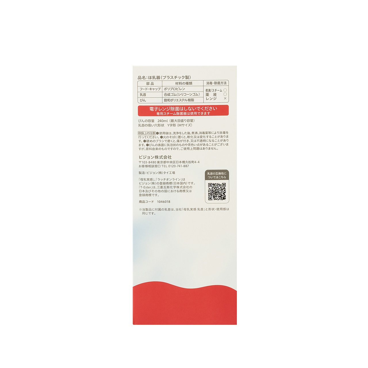 ●容量:240ml ●対象月齢:3ヵ月から ●素材:プラスチック製(T-Ester) ●付属乳首:シリコーンゴム製 Mサイズ(Y字形) ■消毒・除菌方法 ・煮沸/スチーム:○ ・薬液:○ ・レンジ:× ※電子レンジ除菌はしないでください(専用スチーム除菌器は使用可)。 ※本製品はUV(紫外線)消毒に対応しておりません。 ■使用上の注意 ・使用後は、洗浄をした後、煮沸、消毒薬等により消毒を行ってください。 ・火のそばに置くと、軟化又は変化することがあります。 ・硬めのブラシで磨くと、傷が付き、又は不透明になることがあります。 ・びんの表面に気泡状のものや茶色い点があることがございますが、原料由来のものですので、ご使用上問題はありません。 ・洗浄の際、びんの表面を強くこすると印刷が消えることがございます。 ・調乳時、哺乳びんも熱くなります。ヤケドにご注意ください。 ■お取替えの目安 ・ひとつの乳首に赤ちゃんがなじむと、新しい乳首に替えてもイヤがることがあります。 乳首は2個以上を交互に約2ヵ月をめどに使ってください。 破れたり切れたりしないように、古くなったら使用回数にかかわらず、早めに取り替えましょう。 ・乳首は歯の生えている赤ちゃんが、かんで引っ張ると裂けることがありますのでご注意ください。