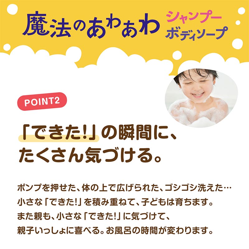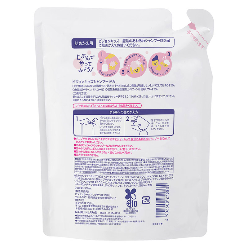 ●内容量:詰めかえ用300ml ・皮フ科医による皮フ刺激性テスト済み(すべての方に皮フ刺激が発生しないということではありません) ・無添加(パラベン、アルコール) ・硫酸系界面活性剤、シリコーン不使用 【使用方法】髪をぬらして適量を手にとり、地肌をマッサージするようにやさしく洗った後、十分にすすいでください。 ※目に入らないようにご注意ください。 <ボトルへの詰めかえ方> 1. パック上部にある切り口から矢印にそって切り取ってください。(液飛びにご注意ください) 2. 注ぎ口をボトルにさしこみ、中身をゆっくりしぼり出してください。 【注意事項】 ●ご使用前に必ず「ボトルへの詰めかえ方」をお読みください。 ●ポンプが作動しなくなりますので必ず「ピジョンキッズ 魔法のあわあわシャンプー 350ml」に詰めかえてお使いください。 ●他のボディソープやシャンプーなどに混ぜないでください。 ●詰めかえる前に、ボトル容器をよく水洗いし、よく乾かしてください。 ●詰めかえ後は、ボトルの表示をよく読んでお使いください。 ●飲み物ではありません。 ●衣類、タオル、洗面台、床などに液が付着すると落ちにくくなるため、注意して使用してください。 ●付着した場合はすぐに洗濯・洗浄してください。 ●傷やはれもの、湿しん等異常のある部位には使用しないでください。 ●赤み・はれ・かゆみ・刺激等の異常が現れた場合は使用を中止してください。 ●目に入ったときは、すぐにきれいな水で洗い流してください。 ●乳幼児の手の届かないところに保管してください。 ●お子様が使用する場合は、必ず保護者の目の届くところで使用させてください。 ●極端に高温や低温、多湿な場所、直射日光のあたる場所には保管しないでください。