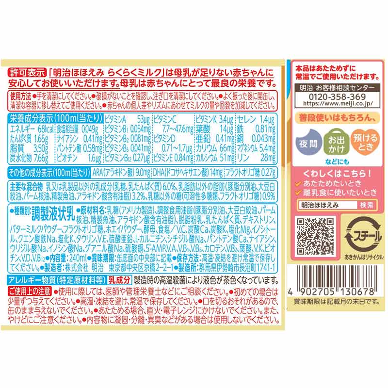 ●種類別:調製液状乳 ●対象月齢:0-1歳頃まで ●内容量:240ml ●原材料:乳糖(アメリカ製造)、調整食用油脂(豚脂分別油、大豆白絞油、パーム核油、精製魚油、アラキドン酸含有油脂)、脱脂粉乳、乳たんぱく質、デキストリン、バターミルクパウダー、フラクトオリゴ糖、ホエイパウダー、酵母、食塩/V.C、炭酸Ca、炭酸K、塩化Mg、イノシトール、クエン酸鉄Na、塩化K、タウリン、V.E、硫酸亜鉛、L-カルニチン、シチジル酸Na、パントテン酸Ca、ナイアシン、ウリジル酸Na、イノシン酸Na、グアニル酸Na、硫酸銅、5-AMP、V.A、V.B1、V.B6、カロテン、V.B2、葉酸、V.K、ビオチン、V.D、V.B12